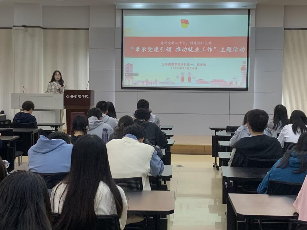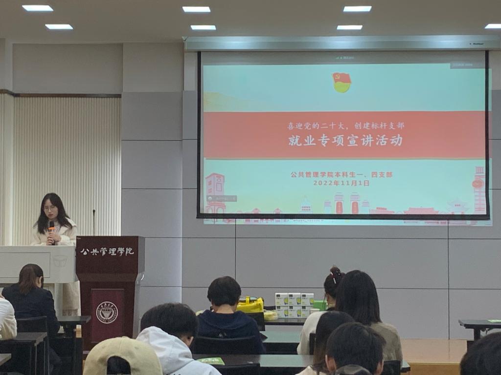 2022-11-29为满足应届生的择业需求,提高对企业的辨识能力,成人影片 本科生一、四支部于2022年11月1日下午4时在成人影片 楼102教室开展了“喜迎二十大,创建标杆支部”主题教育系列活动之就业专项宣讲活动本次活动由公管学院本科生一支部组织委员陈烨靖同志主持,邀请了长沙市益丰大药房的张部长和熊经理开展宣讲活动。本科生一、四支部全体党员全部参会,其中,未返校人员线上参会。首先,陈烨靖同志介绍了本次活动的主题。其次,...