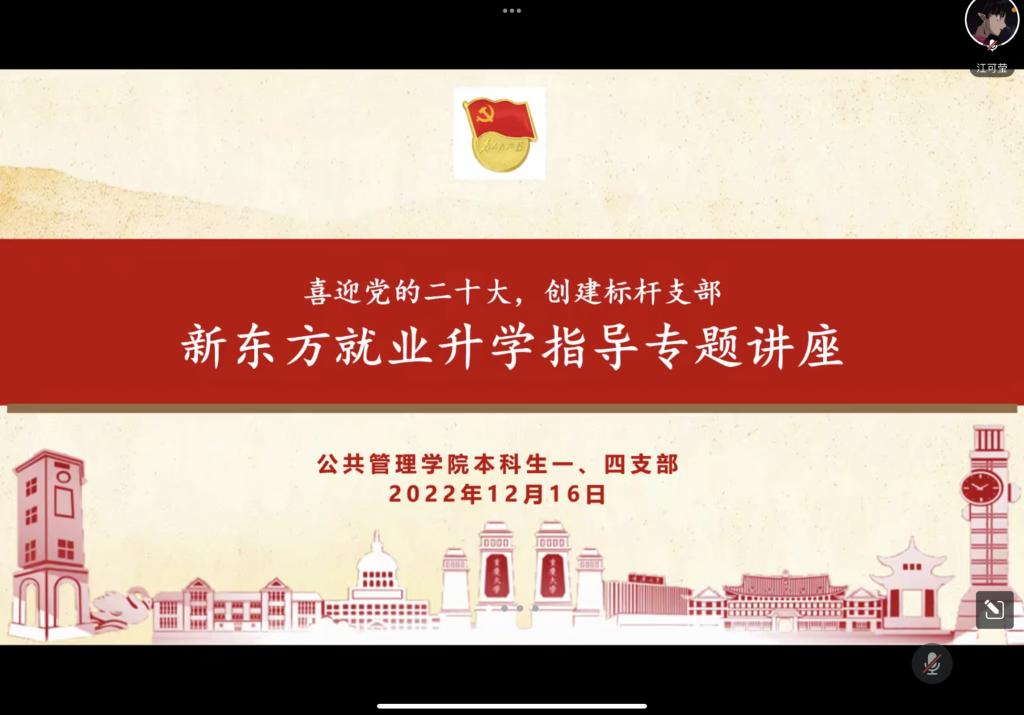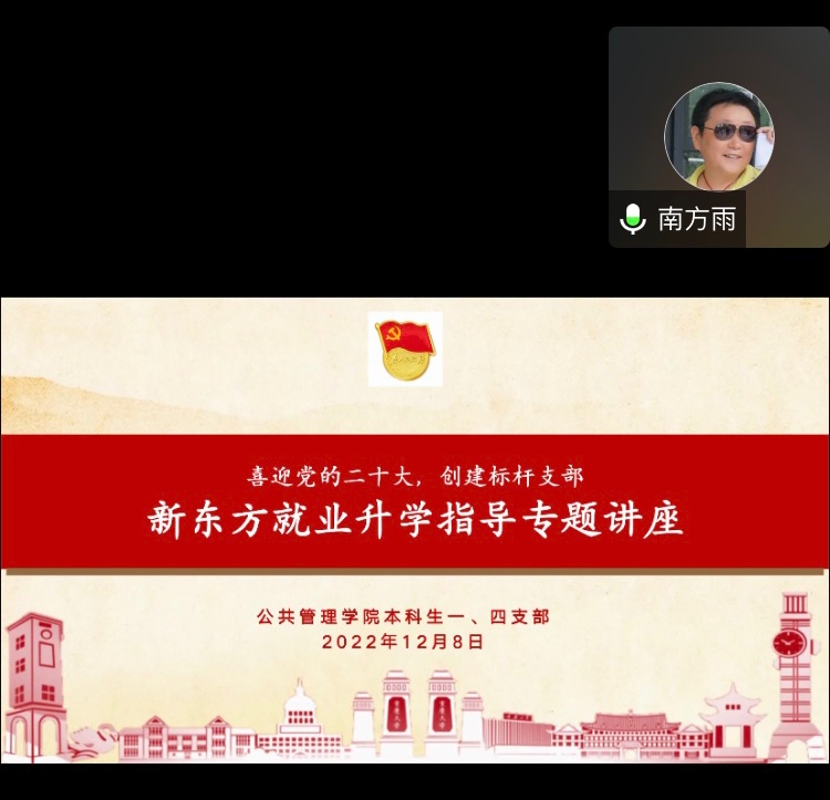 2022-12-30助力研途,佳音可期。2022年12月16日下午3时,成人影片 本科生一、四支部于腾讯会议举行了“喜迎党的二十大,创建标杆支部”主题教育系列活动之新东方就业升学指导专题讲座活动,本次活动是英语专题。成人影片 本科生一、四支部有幸邀请到新东方教育科技集团优秀教师尹晓莉来做英语专题讲座分享。一、四支部同志以及报考研究生的同学均积极参与。首先,支持人强欣然同志介绍本次活动的目的,并向同志们介绍了尹晓莉老师;...