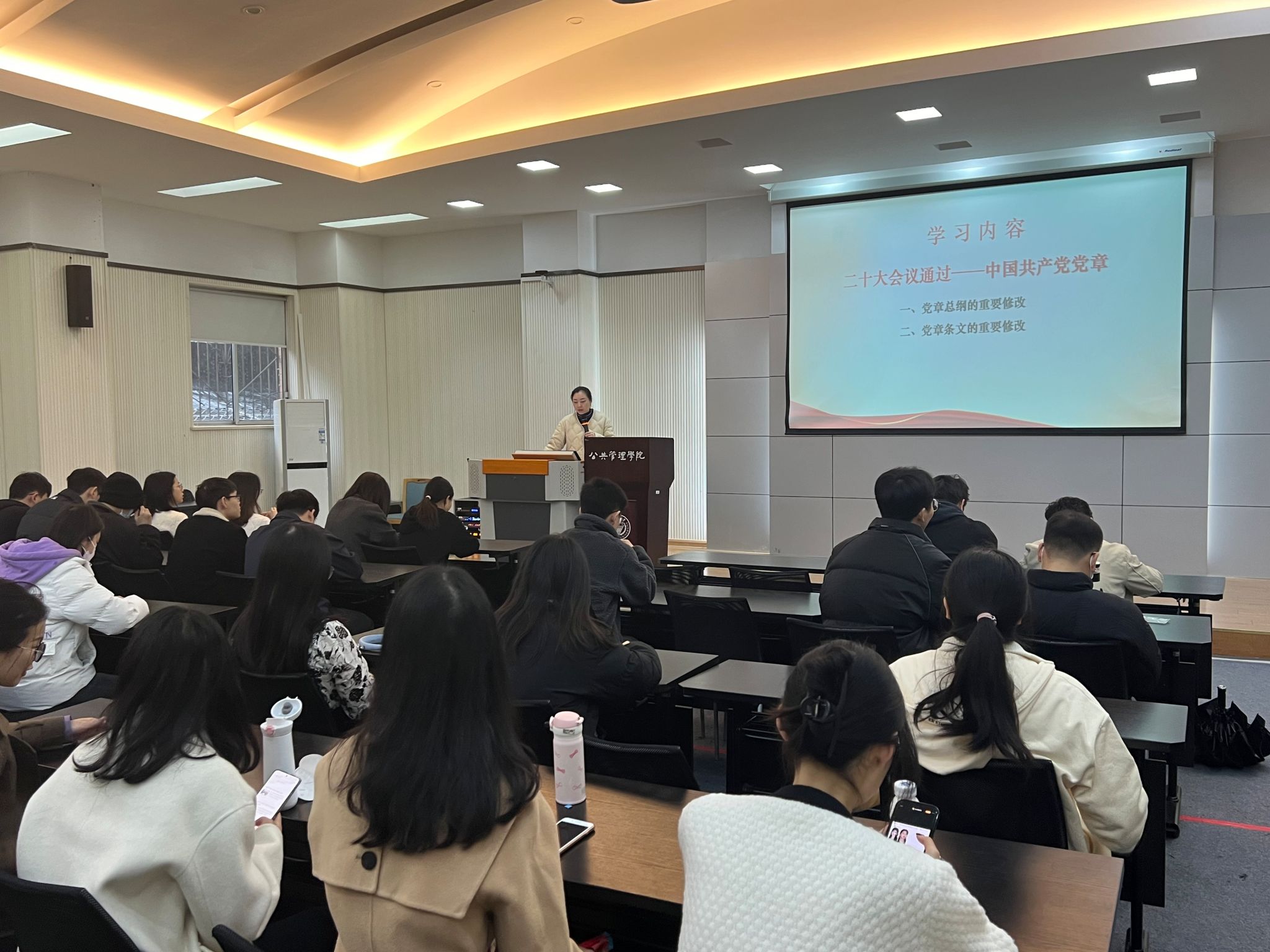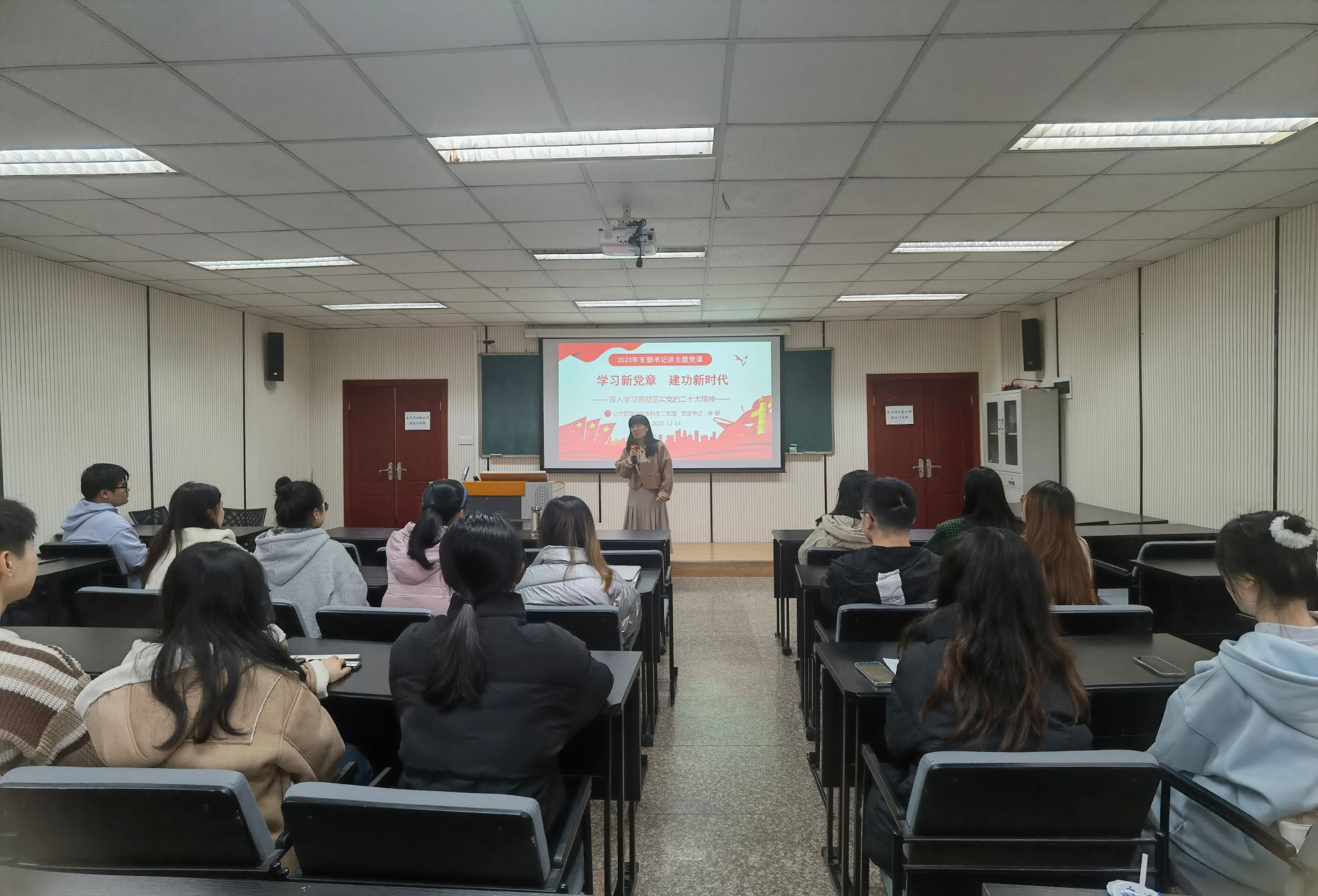 2023-12-25为深入学习党的二十大精神,扎实开展学习贯彻习近平新时代中国特色社会主义思想主题教育,引导带动学生党员进一步增强党的意识、党章意识、党员意识,更好地凝聚思想共识、增强前行动力,成人影片 本科生二支部书记徐柳、五支部书记陈致远于2023年12月14日下午在学院106教室为两个支部全体党员讲授了“学习新党章,建功新时代”的主题党课。首先,二支部书记徐柳围绕《中国共产党章程》的概况、党章的发展历程和学习新党章的...