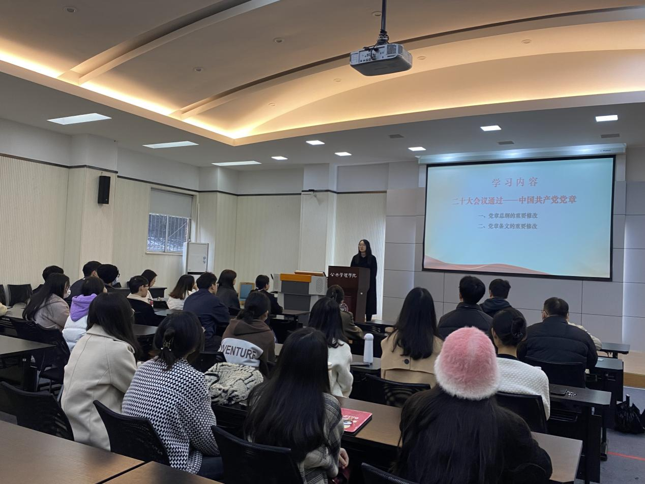 2023-11-30为进一步学习贯彻党的二十大精神,加强党员思想淬炼,夯实理论武装,在深学细照笃行中提升政治素质,11月30日下午,研究生五支部书记裴绍蓉带领研究生五支部全体党员专题学习《中国共产党章程》。裴绍蓉围绕党章的重要地位、党的二十大对党章的修改、学习贯彻新党章的核心内容进行了系统阐释和深入解读。通过分享微动漫系列片《二十大党章新知识点大家学》,用通俗易懂、鲜活生动的动漫形式介绍党章的主要修改知识点,加深学生...