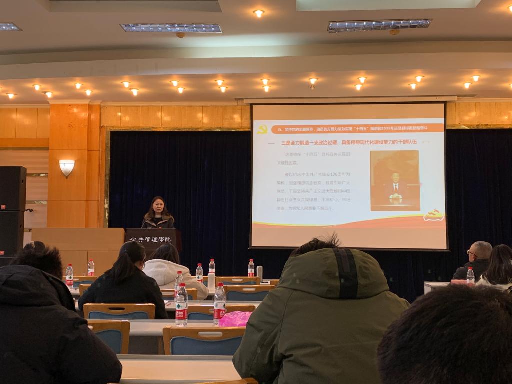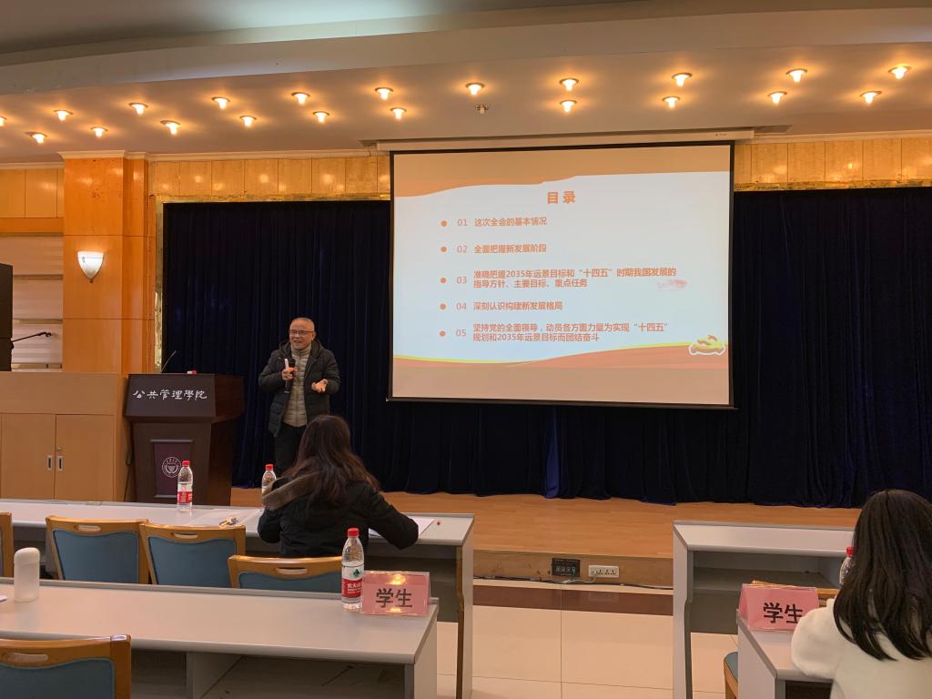 宣讲党的十九届五中全会精神。马克思主义学院何跃教授作题为“党的十九届五中全会精神解读”的宣讲报告。宣讲报告会由学院党委书记张玲主持。