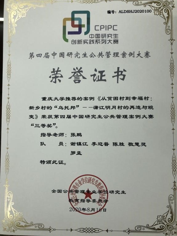 副院长、教授、博士生导师张鹏老师指导下,由在读学硕谢镇江同学和李迎普、罗孟、陈胜、敬慧灵等MPA学员组成的民主湖队在新冠疫情背景下克服困难,通过实地调研和电话访谈等线上线下相结合的形式圆满完成了调研和案例撰写工作。最终,团队在全国一千三百余支队伍中晋级32强入围全国决赛,团队作品《从贫困村到幸福村:新乡村的“乌托邦”——蒲江明月村的再造与蜕变》获得全国三等奖。