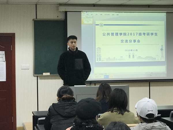 随后,2016级考研成功学生代表分别讲述了自己的考研经历,就冲刺阶段备考、考场中遇到的常见问题和心态调整等方面做了分享。以笔试第一成绩考取应用经济学专业的龚文琴同学说到,报考经济专业的同学一定要注意数学的复习,不要因为数学成绩而影响整体结果,同时要放大自己的优势科目,为自己取得高分打牢基础。从经济类专业跨专业考取公共管理专业研究生的许耘浩同学则强调,一定要注意政治、英语和专业科目知识点的系统梳理和答题逻辑框架的构建,不要死记硬背,而要注重举一反三。另外几名同学也提到,考前冲刺阶段要调整学习时间,抽出完整时间多做真题,找准“兴奋点”;考场上调整心态,遇到难题冷静处理;考场上遇到问题及时向监考老师反映,不紧张慌乱而影响答题状态等。