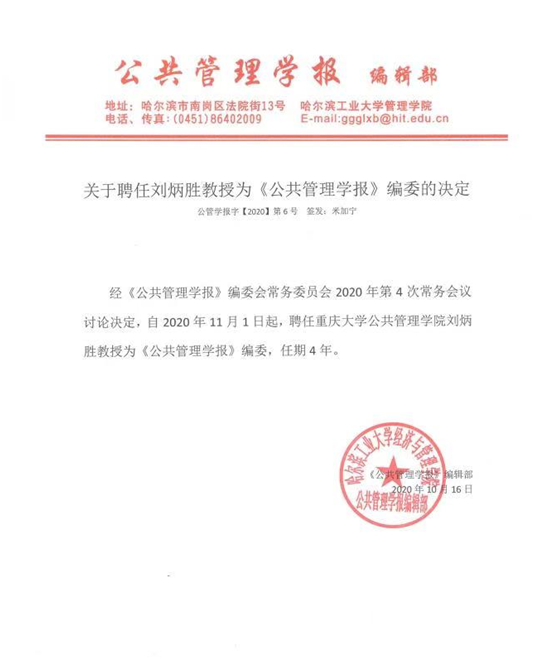刘炳胜教授为《公共管理学报》编委,任期4年。