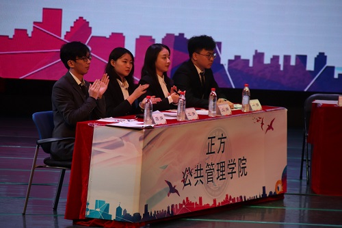 在接下来的环节中,双方辩手分别就对方的论点展开驳论,你来我往,战况激烈。在唇枪舌剑中,在一个又一个回合的交锋中,观众席不断地爆发出掌声与喝彩。在最后的点评环节,评委说到本场比赛的双方确实势均力敌,各有千秋。在文风上,学院辩论队获得了评委的一致青睐。评委也特别提到,学院二辩谢欣露的从容与条理令人印象深刻;四辩刘洋儒雅的气质则让人在剑拔弩张的辩论场上也如沐春风。