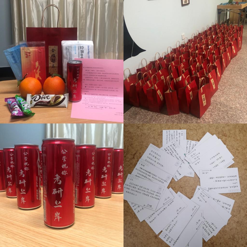 定制口罩、慰问信、巧克力、定制“考研上岸”可乐、橙子和棒棒糖等礼品,以橙子和棒棒糖寓“心想事‘橙’”、“金‘棒’题名”,处处表达着学院对同学们的殷切祝福。各班班委也通过手写贺卡的方式为考研的同学们加油鼓劲。