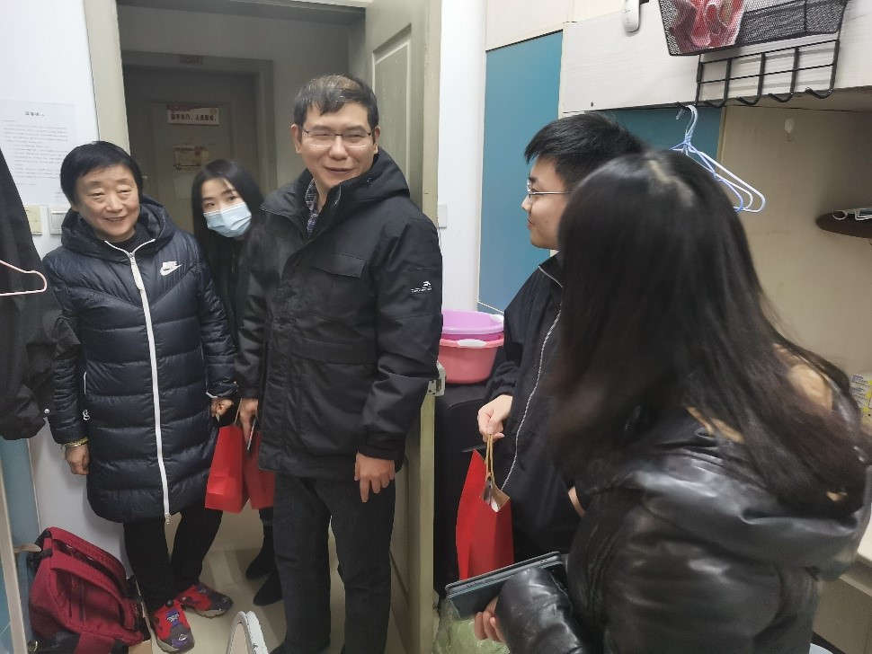 从绿树阴浓到岁暮天寒,公管的考研学子们,守着一方书桌走过夏雨秋风,来到冬天的尾巴。2021年12月23日晚,考研前夕,为鼓舞学生的考研信心、舒缓其考研压力,公管学院党委书记张玲老师、党委副书记袁晓浩老师、学办主任兼2019级辅导员王丽娟老师、团委书记兼2018级辅导员徐柳老师和李珊珊老师带着精心准备的考研慰问品前去慰问备考同学,向同学们传达学院的慰问和殷切期盼。