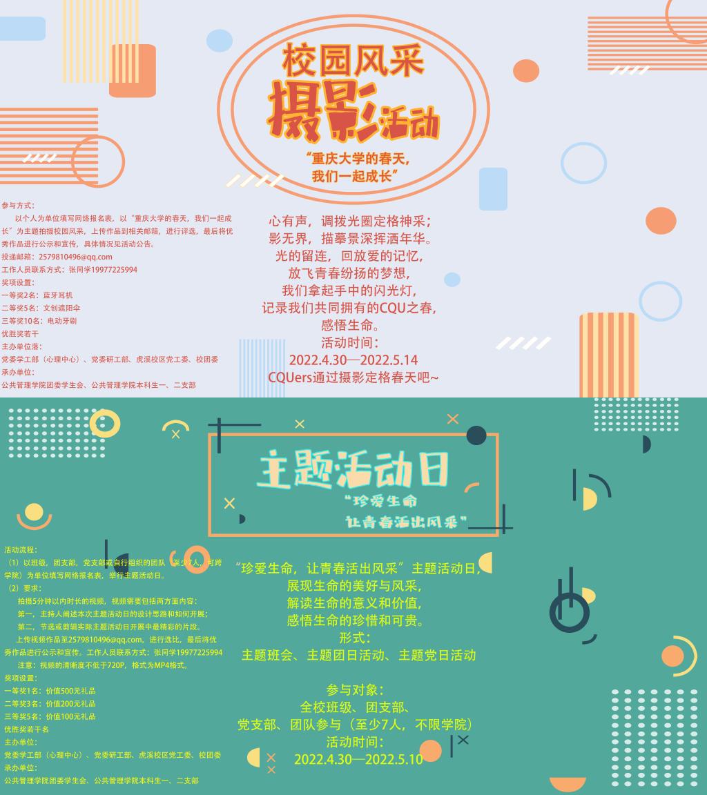本次“珍爱生命,让青春活出风采”生命教育系列活动除了T恤绘画活动之外,还有主题活动日评选和校园风采摄影两个活动也在紧锣密鼓的开展中。其中主题活动日评选鼓励同学们召开一次以“珍爱生命,让青春活出风采”为主题的班会、团日活动、主党日活动或其他形式的活动日,拍摄视频片段参加评选和展示;校园风采摄影活动是在全校范围内收集以“成人影片