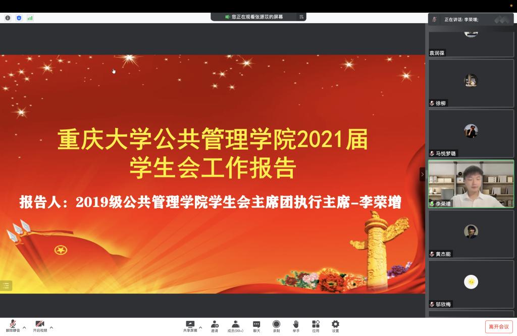 接下来,2019级学院学生会执行主席李荣增代表2021届学生会作工作报告。李荣增首先向大家介绍了2021届学生会所取得的各项成果和荣誉,从思想引领、组织建设、校园活动、社会实践与志愿服务四个方面详细介绍了学生会工作情况,并祝愿下一年学生会工作顺利开展。张源苡对学院2022届团委学生会换届选举结果进行公示,全体与会同学审议并通过换届选举结果。