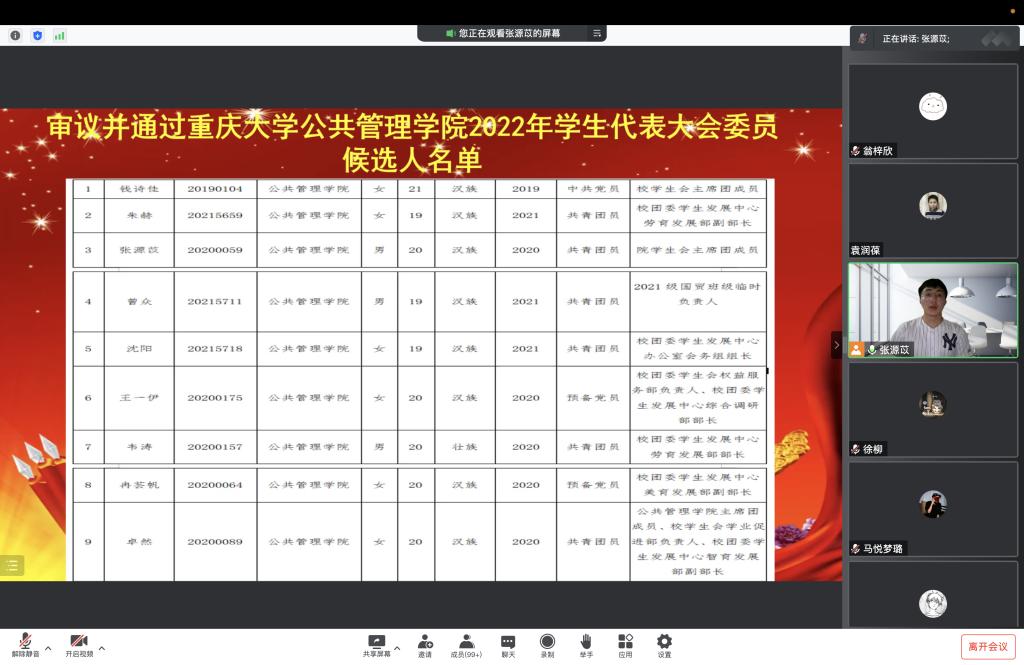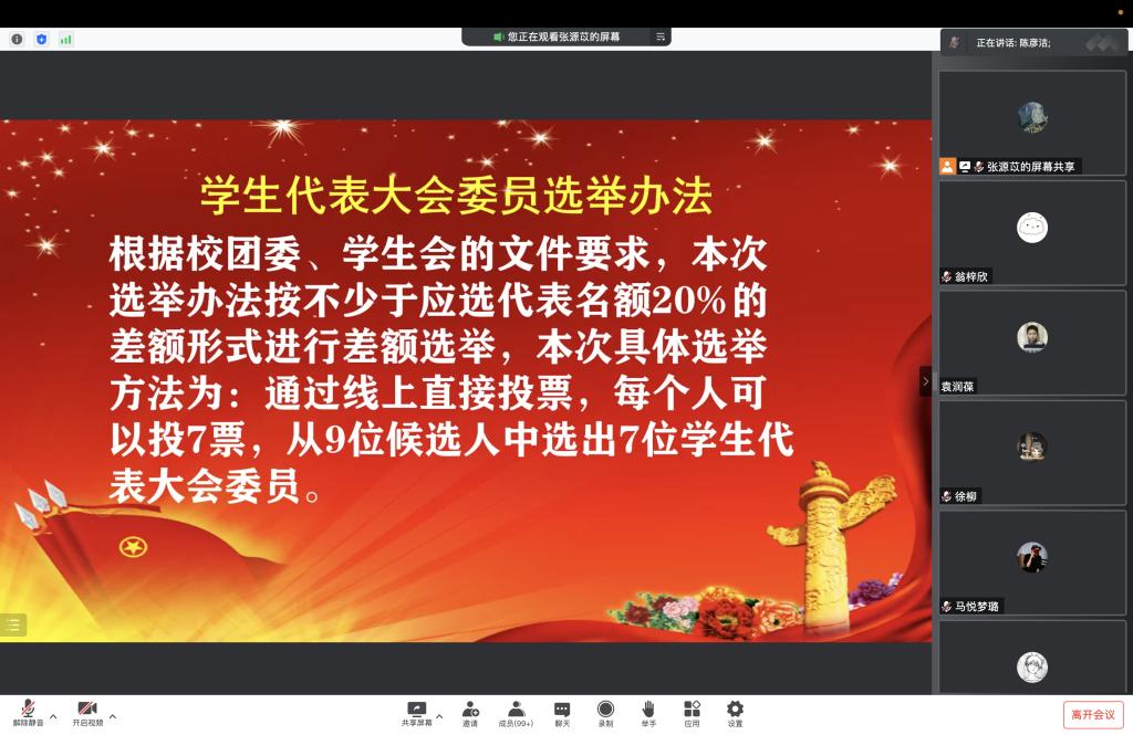 2022年学生代表大会于线上召开。学办主任兼19级辅导员王丽娟、团委书记兼21级辅导员徐柳,及逾百名来自2019级、2020级、2021级的本科生参与本次会议。