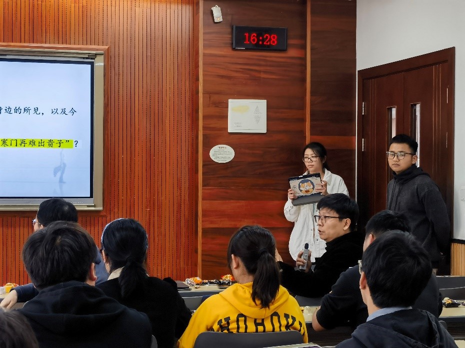 根据《不平等的童年》书中的内容,结合中国的现实情境,刘一笑老师提出了两个辩题:议题(a)“寒门出贵子”还是“寒门再难出贵子”?以及议题(b)“鸡娃”还是“躺平”?读书会现场采取自由辩论的形式,学生选择自己支持的观点,在教室内调整座位。经过十分钟的讨论后,学生主动举手表达自己的观点。关于第一个辩题,有同学结合自己上学期间的经历,认为如今寒门后代通过奋斗进行阶层跨越的难度变大,但依然有成功的例子;有同学结合“双减”政策的颁布,认为这一政策初衷非常好,但需要有相应的配套措施,以免出现寒门后代教育资源被剥夺的现象。关于第二个辩题,有同学认为“鸡娃”这一现象虽然形式较为极端,但其所暗含的奋斗精神却是我们应该倡导的;还有同学认为“躺平”也不失为一种人生态度,但在行动上依然需要借鉴“鸡娃”的精神内核,通过努力奋斗实现人生价值。通过辩论的形式,同学们更加深刻地理解了书中的内核,并对中国的社会不平等进行了思考。