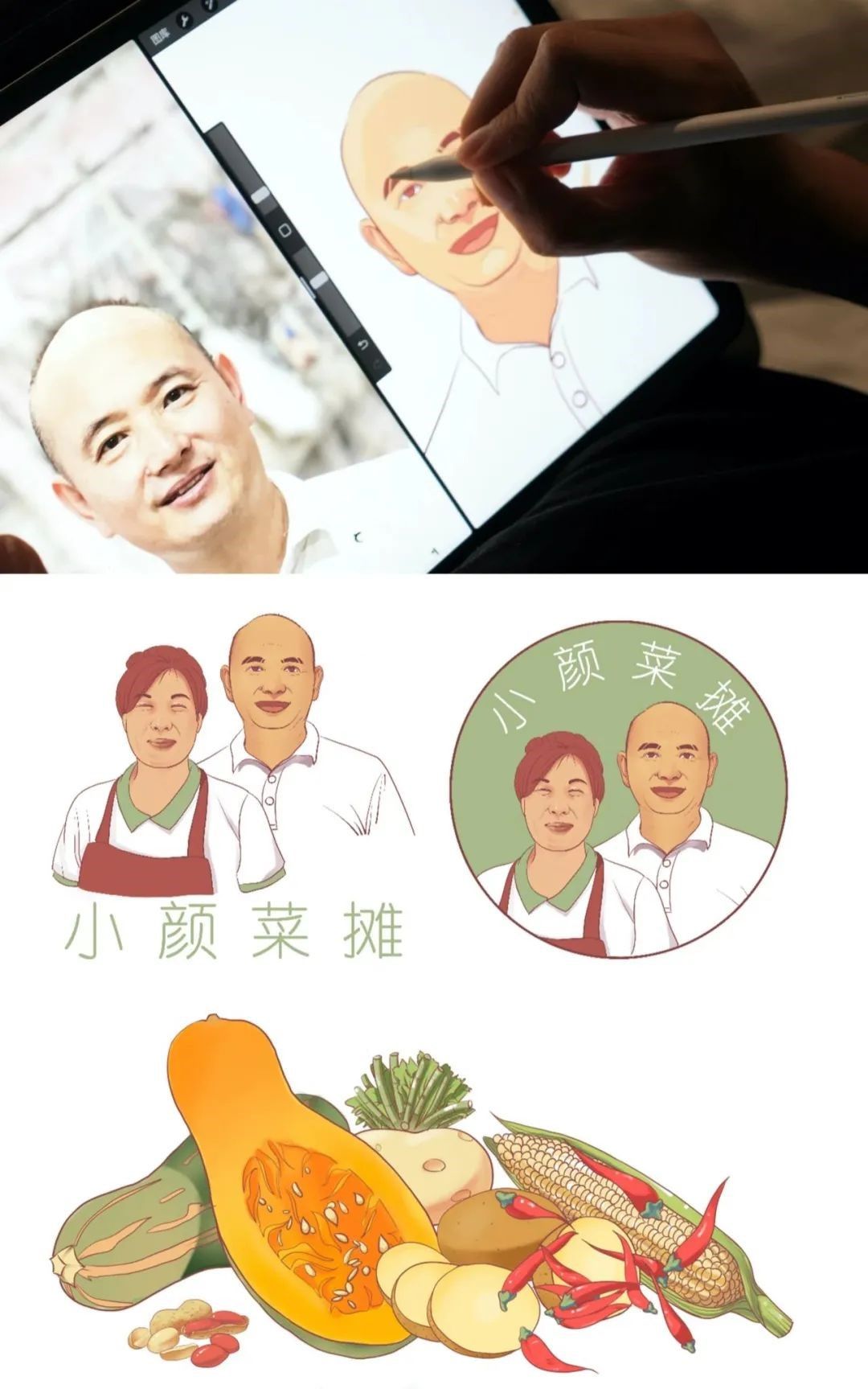 在“深入调研”和“共建输出”部分,同学们在菜市场中用心去倾听摊主们的故事,坚守数十年“防空洞泡菜”的唐叔叔和李孃孃、蒋姐和黑妹间的守望相助、走遍中国后归隐于菜摊的陈姨和霍叔、陈叔与李姐的不离不弃,许多的人间温情故事,乐观积极的生活态度被记录,在身体力行的实践过程中,用心去体察摊主们的真实生活;同学们从微观之处,按图索骥了解整个菜市场的协作体系,再通过专业视角分析菜市场摊主们的现状,带着初期的观察、思考与导师组一起碰撞交流,分别通过各自擅长的设计、绘画、影像等方式,为摊主制作招牌,也通过艺术创作的方式向社会各界传递对这一群体的关注和理解。
