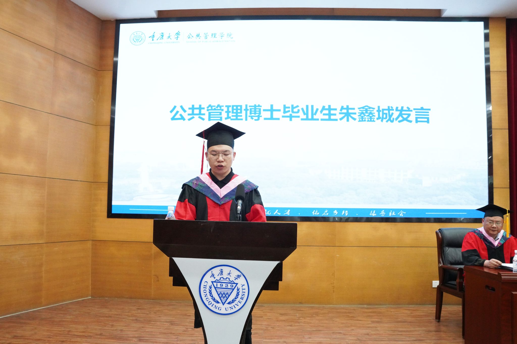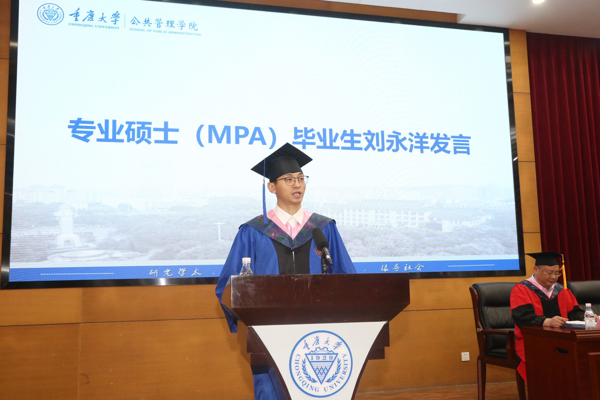 专业学位硕士毕业生代表刘永洋发言,他回眸了在重大的三年时光,真诚地感恩母校、学院和各位老师,分享了在校期间个人的成长和蜕变。他祝愿同学们鼓足勇气,奋勇向前,乘风破浪,扬帆起航,看山河广阔,铸辉煌成就,享人间值得。