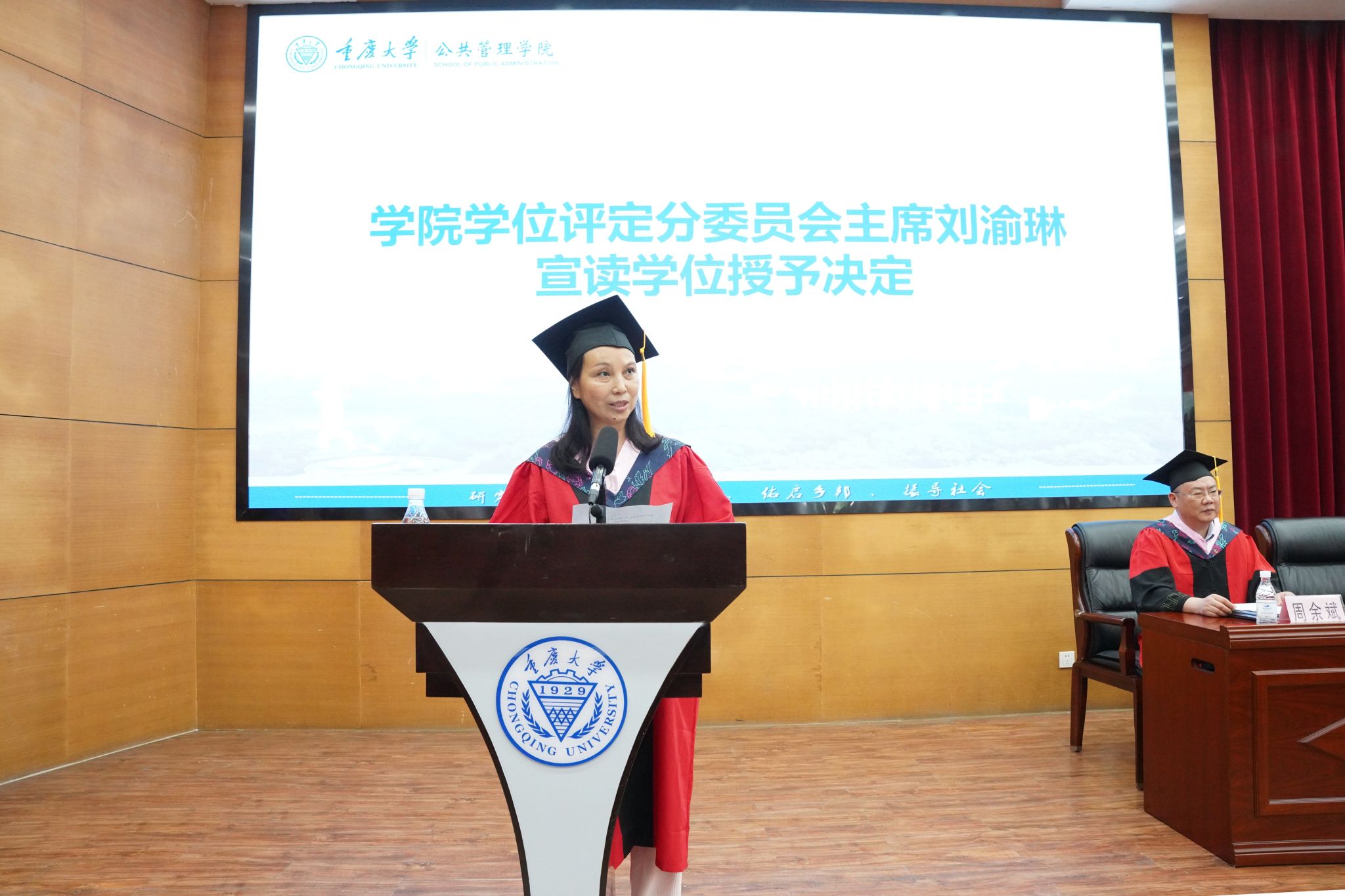学位评定分委员会主席刘渝琳宣读学位授予决定,全场共同鼓掌祝贺449名获得学位、顺利毕业的同学。