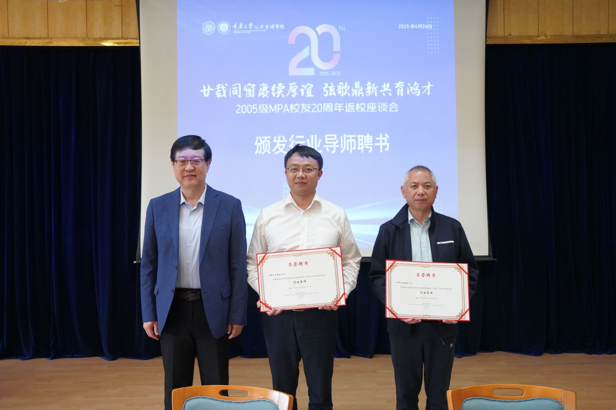 学院党委书记陈东向肖路明和陈戴林两位校友代表颁发行业导师聘书。两位受聘校友表示,将充分发挥业界经验优势,通过建立常态化指导机制,助力青年学子成长成才,赓续学院育人传统。
