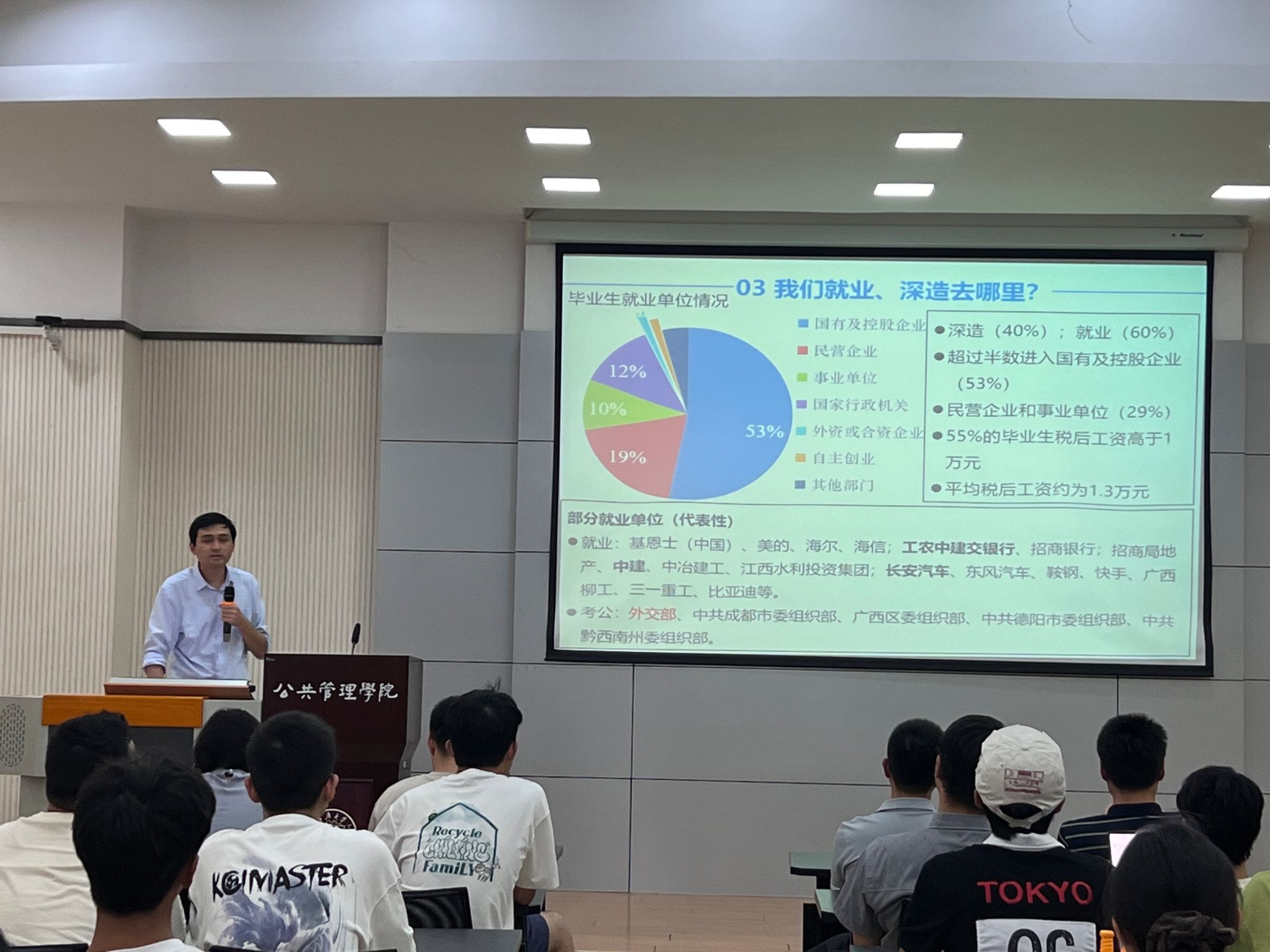 老师们系统解读课程体系,包括中国经济专题、数字经济学、中级微观与宏观经济学等特色课程,分享了往届毕业生发展数据——60%选择就业,其中53%进入国有及控股企业,29%就职于民营企业和事业单位,40%选择深造。