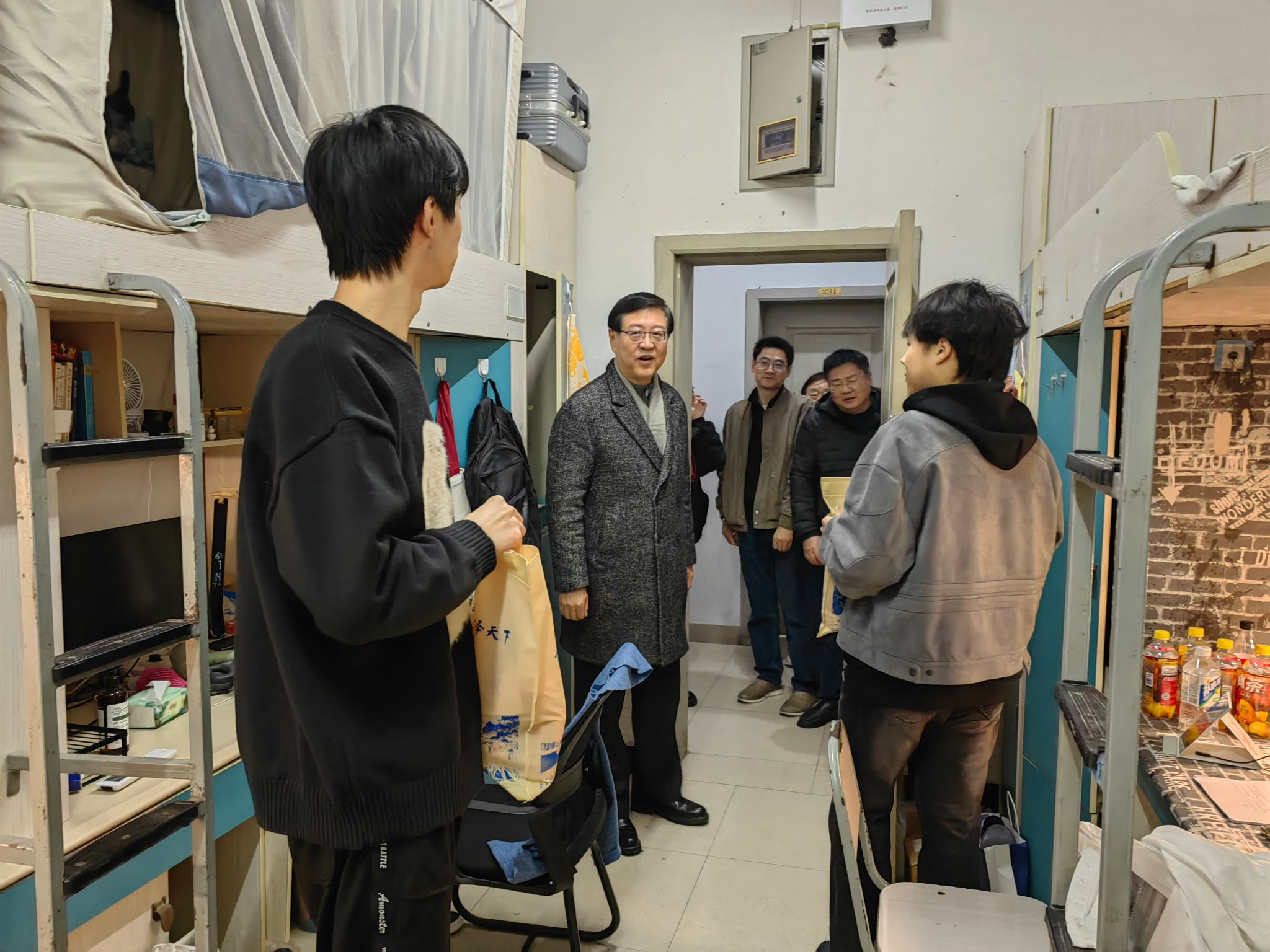 学院领导和老师们先后前往学生宿舍五舍和八舍对同学们进行了亲切的关怀和慰问。陈东书记鼓励同学们放平心态,轻松应考,面对压力要学会自我调节,需要时寻找老师和同学的帮助,学院永远是大家坚实的后盾;周余斌副书记仔细询问了同学们的备考情况,叮嘱同学们在考研备考的最后阶段不要松懈、保持状态,以必胜的姿态走向考场,在考试时应当保持冷静,沉着应战。