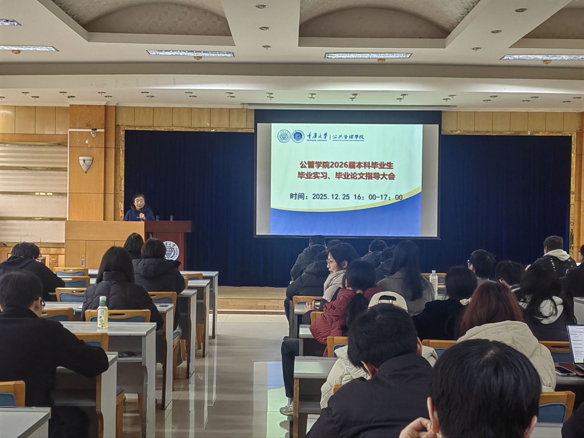 为精准赋能2026届本科毕业生稳步推进毕业论文撰写、圆满完成毕业实习任务,2025年12月25日下午16:00,学院在102报告厅隆重召开专题指导大会。学院党委副书记、纪委书记周余斌,副院长丁从明莅临会议指导,会议由2026届本科毕业生辅导员王丽娟主持,全体毕业生齐聚现场参会。