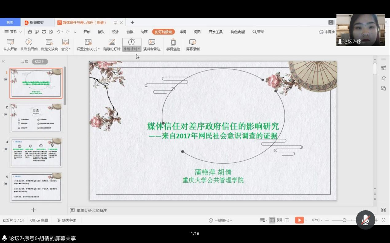 蒲艳萍教授指导下完成的《媒体信任对差序政府信任的影响研究——来自2017年网民社会意识调查的证据》,胡倩同学主要从媒介视角切入,借助2017年网民社会意识调查数据,实证探究官方媒体信任和非官方媒体信任对差序政府信任的影响。认为提升基层政府信任和实现政府信任层级均衡化应从高层政府、基层政府和网民三个主体出发。深圳大学城市治理研究院副院长、副教授谷志军老师,就胡倩的汇报从理论、方法、变量等方面提出了相关的建议。胡倩同学也表示,谷老师的点评很到位,对自己的论文修改有很大的帮助,参加此次会议自己也是收获颇多。