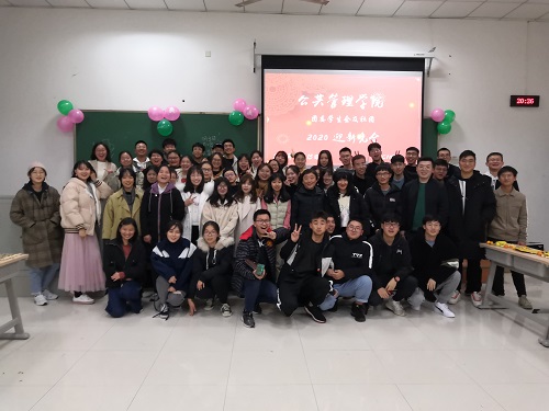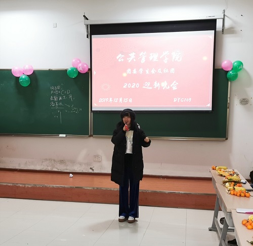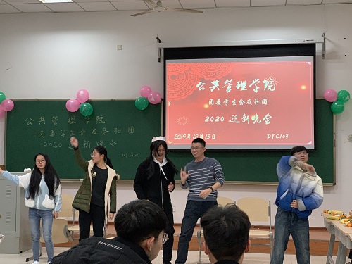 201912151830,公管学院于DYC103举办了本科生团委学生会、各社团2020年迎新晚会。出席本次晚会的老师有学办主任兼1819级辅导员王丽娟、院团委书记兼16级辅导员徐柳、17级辅导员包晗、辅导员助理谢镇江。学院团委学生会以及各社团成员全员参与。