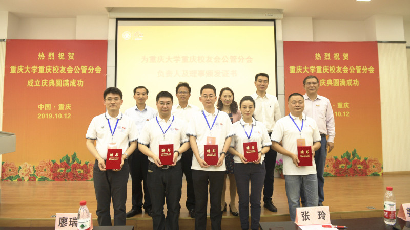 重庆校友会公管分会正式宣告成立。与会领导嘉宾上台为新当选的公管分会负责人和理事一一颁发聘书。