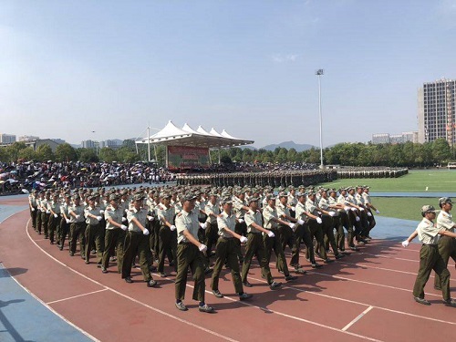 之后还汇演了精彩绝伦的应急棍术、盾牌术,军乐连与合唱团也献上了歌颂祖国的赞歌。本次军训汇演在送师旗环节中进入尾声,与教官再难忘的相遇,终究也会别离,在一声声道别的军中柔情中,看台上的观众竟也不觉泪目。随后齐唱校歌,本次军训汇演在“复兴民族兮,誓作前锋!”的旋律中落下帷幕。在一系列表彰结束后,公管学院组织了19级全体同学于主席台进行了合照,以纪念这一难忘的历程。