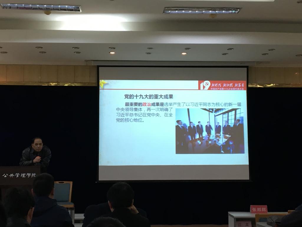 2017年11月23日下午3点,公管学院党委在二楼多功能厅举行了党的十九大精神学习宣讲,邀请了马克思主义学院梁平教授作宣讲嘉宾。学院全体教师参加了此次宣讲。