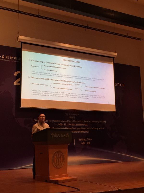 杨宝副教授以《Embedded Structure, Resource Mobilization and Contract Performance: An Empirical Analysis from Outsourcing Social Service Delivery in China》论文在“Solving the Puzzle of Nonprofit Performance” 平行论坛上做了学术报告,通过三个典型案例的运行过程,提出政府购买项目绩效的“资源归因”逻辑,解释了相同制度环境下社会组织项目绩效却存在显著性差异的原因。随后,杨宝副教授(通讯作者)合作完成的《Salary Curse and Intention to Leave Nonprofit-Sector: Evidence from China National Survey 2014》论文,由其合作者在“Human Resource Management in Nonprofit Organizations“平行论坛上做了学术报告,通过2014年中国公益行业发展现状调查数据,分析了工资待遇对公益人才流失的影响,发现中国非营利部门存在“工资诅咒”现象。报告结束后,学者们在论坛上针对相关研究问题进行了热烈的讨论和交流。