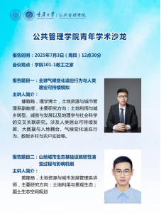 土地资源与城市发展管理系璩路路副教授和黄隆杨博士分别做了题为《全球气候变化适应行为与人类居业可持续模拟》《山地城市生态基础设施韧性演变过程与影响机制》的报告。璩路路解析了围绕气候变化下全球可持续危机,气候适应行为推动人类的生存与发展同生态之间的矛盾缓解,研究论证了气候变化适应行为与环境影响缓解之间的协同作用,以指导政策制定者和农户进行可持续适应。黄隆杨以2022年夏季重庆都市圈持续多发性森林火灾为切入口,探讨了在自然灾害等急性冲击下山地城市生态基础设施韧性演变的时空过程,旨在为山地城市国土空间生态保护修复提供空间政策参考。