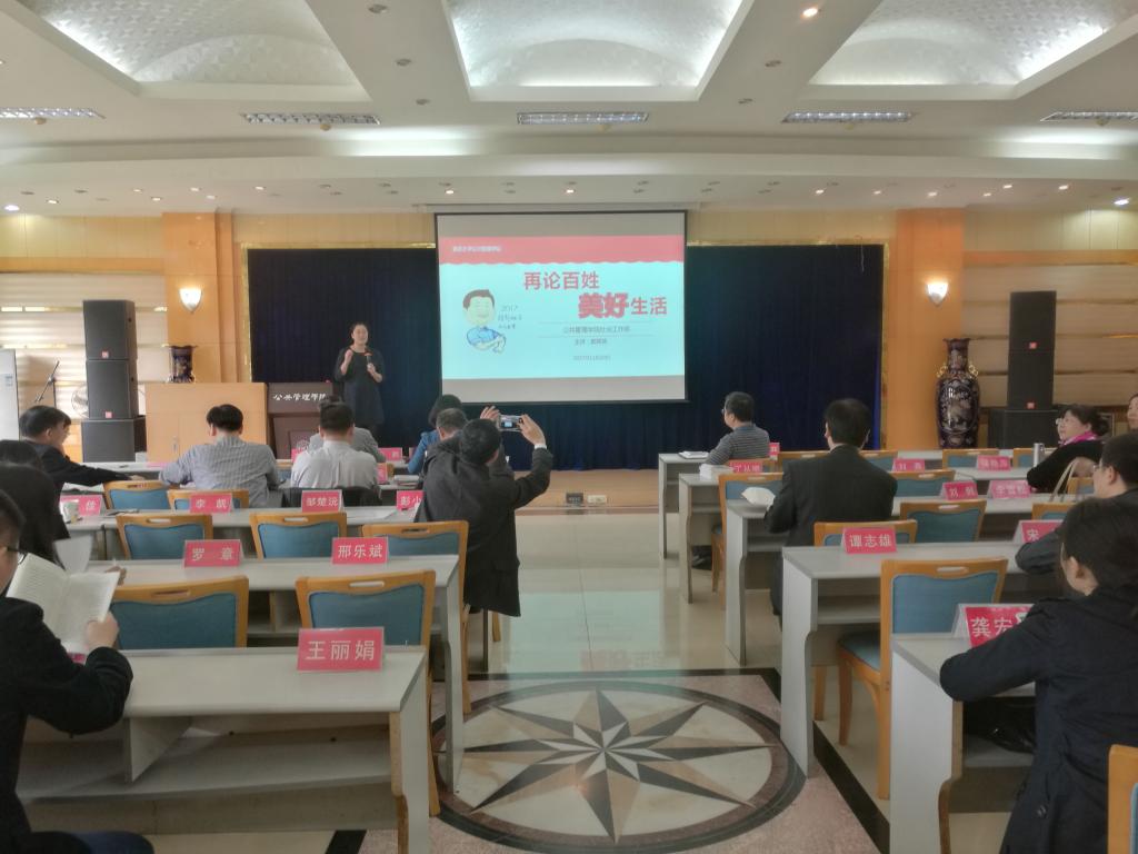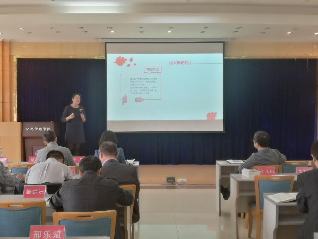 党委组织学院全体教师在多功能厅进行专题学习,深入学习党的十九大报告。本次学习由学院党委书记兼常务副院长张邦辉主持,由社会工作系郭英慧老师主讲。
