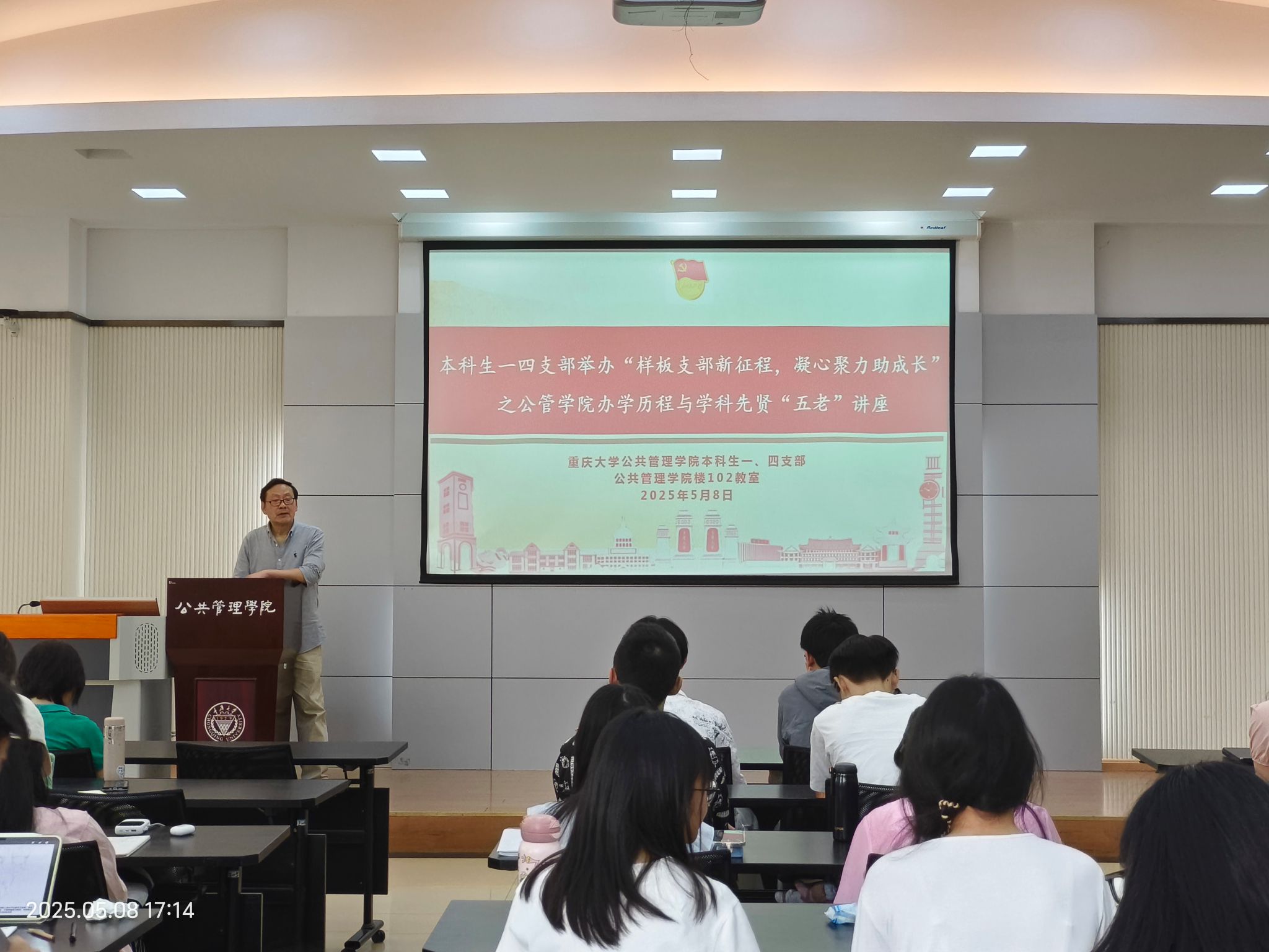 为传承学院历史,弘扬科学文化,彰显“五老”关爱下一代精神,强化思想引领,2025年5月8日15时,学院本科生一、四支部于学院楼102教室举办“样板支部新征程 凝心聚力助成长”之公管学院办学历程与学科先贤“五老”讲座。本次活动由一支部书记王丽娟组织展开,邀请到公管学院退休老教授赵有声主讲,一四支部党员及2022级全体团员以及入党积极分子积极参加。