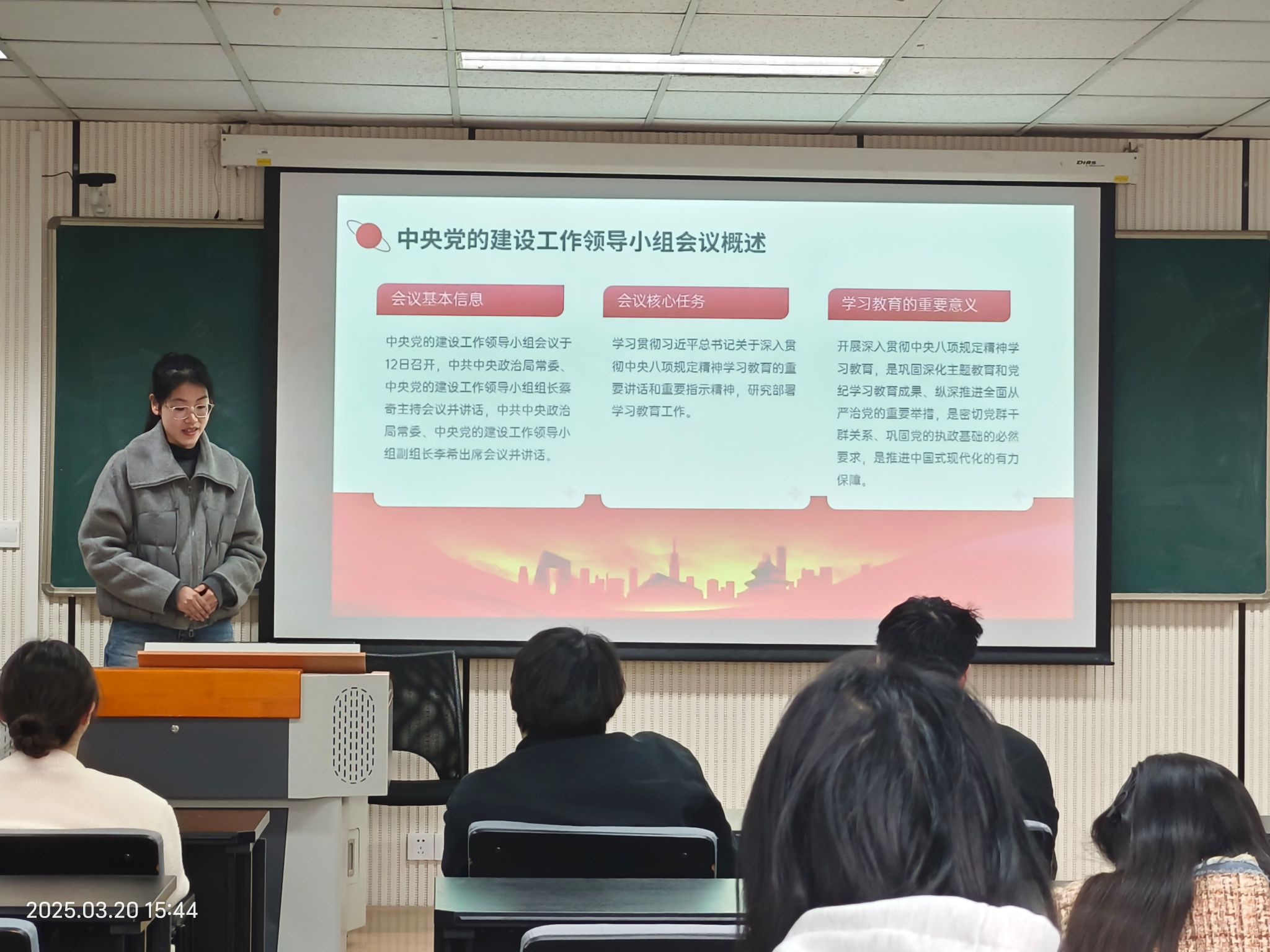 本科生一、四支部在学院楼106教室联合开展"样板支部新征程,凝心聚力助成长"之共同研读“中央八项规定精神”活动。在一支部书记王丽娟统筹组织下,第五党小组成员阙丽青主持活动,一、四两支部全体党员通过理论研读与思想碰撞,共同探寻作风建设的精神坐标。