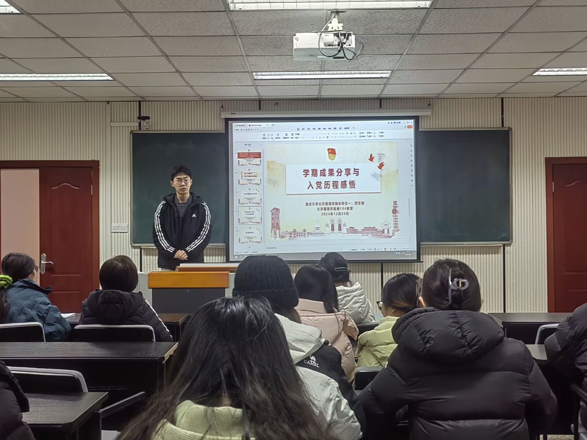 听完汪涛院长的讲话后,台下响起了剧烈的掌声,同学们情绪高昂。于是来到第二个环节,在学期成果分享和入党历程感悟中,同学们纷纷有序上台发言分享。其中,王焙琪同志回顾了自己在成为班级团支书后组织同学们开展的团日活动,他表示自己在这其中得到了极大的锻炼,有信心在以后的学习生活中为班级团日学习做出更多的贡献。徐俊儒同志则阐述了自己如何将党员学习与学科学习结合起来以达到了良好的进步,他认为党员学习可以有效提高我们的思想、政治觉悟,然后将其运用到日常的学习中,便使我们的专业能力得到了提升。