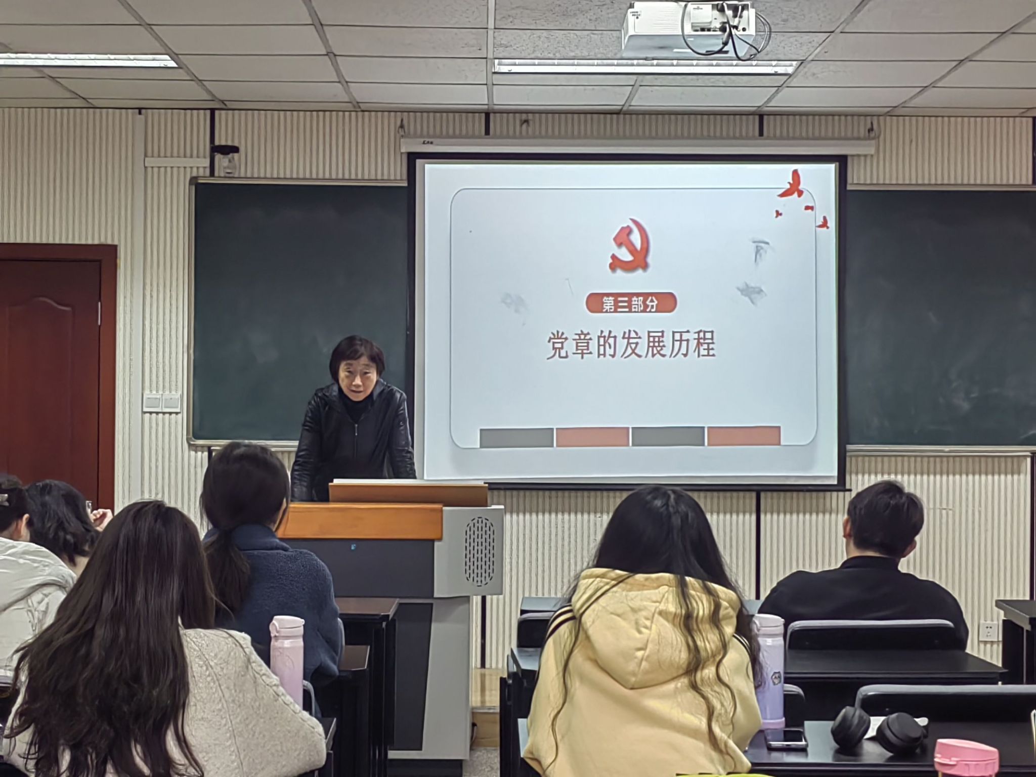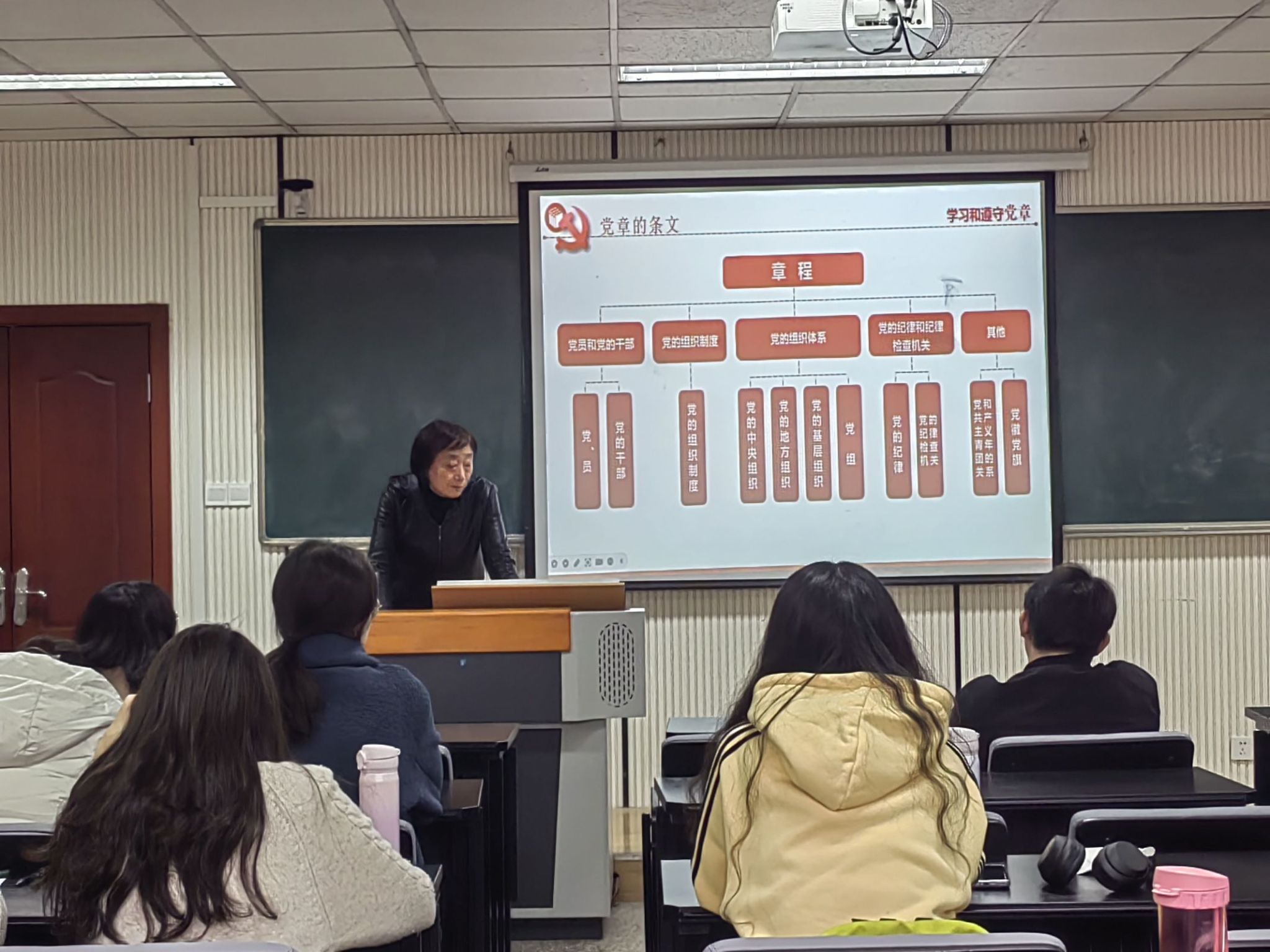 2024年11月28日13:00,为深入推进学习贯彻党的创新理论,特别是党的二十大精神,增强全体党员对党章的理解和认同,学院本科生一支部于学院楼104教室成功举行了“样板支部新征程,凝心聚力助成长”之支部书记讲党课之党章学习活动。此次活动由本科生一支部书记王丽娟主讲,本科生一支部全体党员、预备党员积极参与。