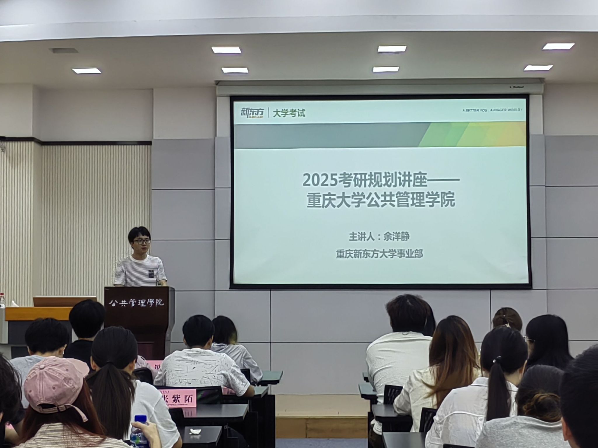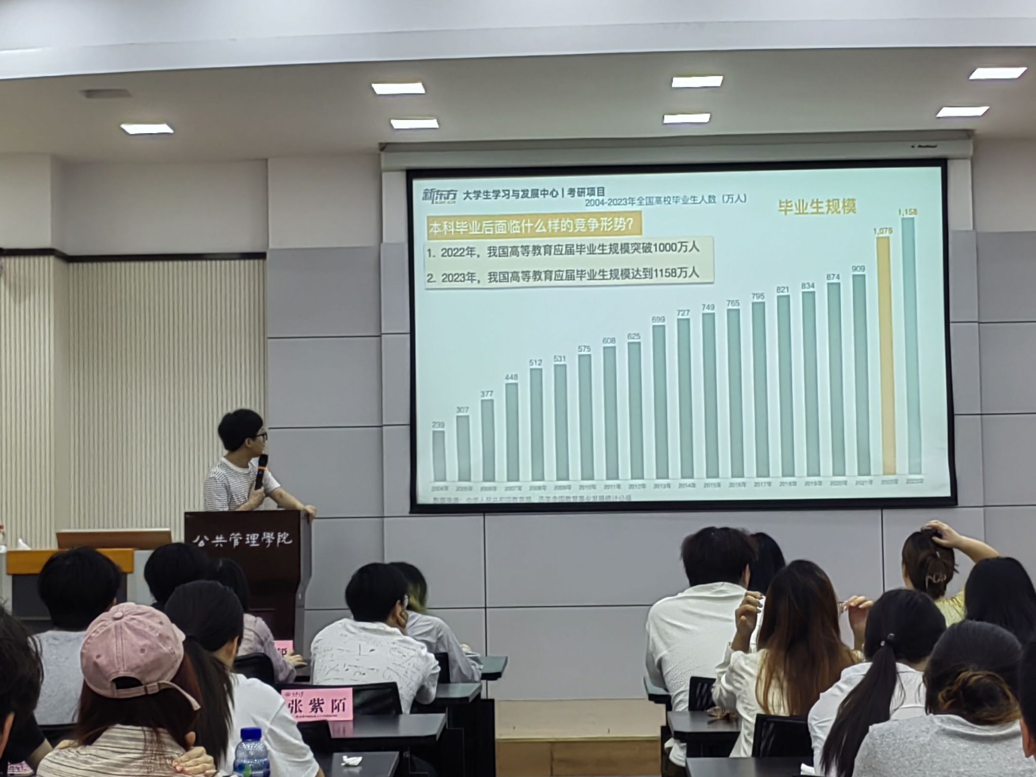 讲座伊始,本科生一支部书记王丽娟同志发表了热情洋溢的致辞,她强调了考研对于学子们未来学术及职业发展的重要性,并希望通过此次讲座,能够为大家提供有益的指导和帮助。随后,新东方资深考研规划师余洋静老师上台,围绕考研形势、备考策略、院校选择等方面进行了深入浅出的讲解。