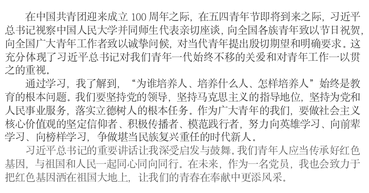 袁凤同志谈到:“习近平总书记的重要讲话让我深受启发与鼓舞。我们青年人应当传承好红色基因,与祖国和人民一起同心同向同行。在未来,作为一名党员,我也会致力于把红色基因洒在祖国大地上,让我们的青春在奉献中更添风采。”