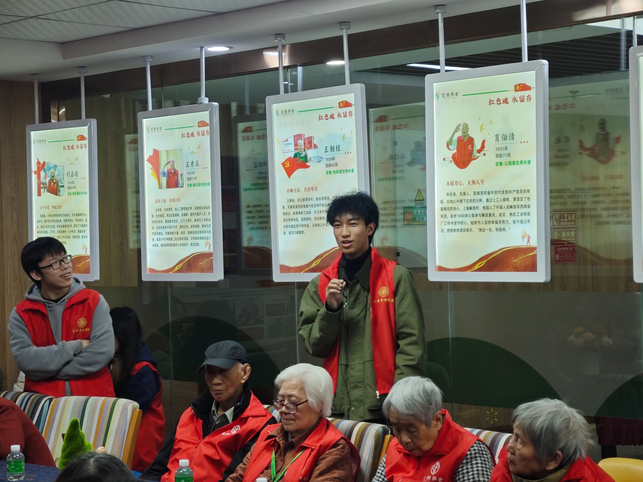 志愿者团队在社区养老服务中心工作人员的带领下参观了整个中心,对国家深化养老服务改革有了真切的感受和体会。中心的20名老党员代表也欢迎了志愿团队的到来,并以“传承红岩薪火”为主题和同学们开展了亲切的交流活动。