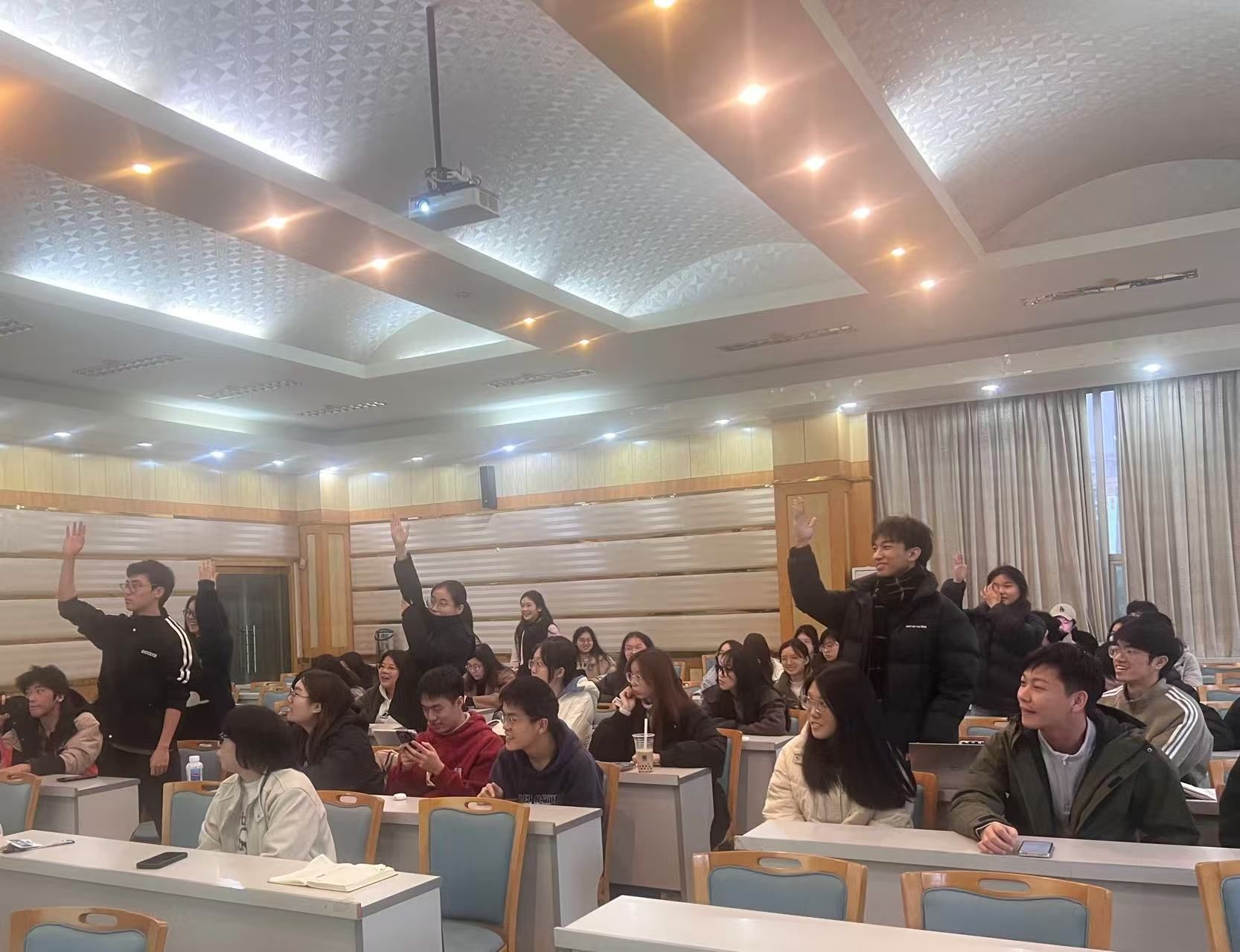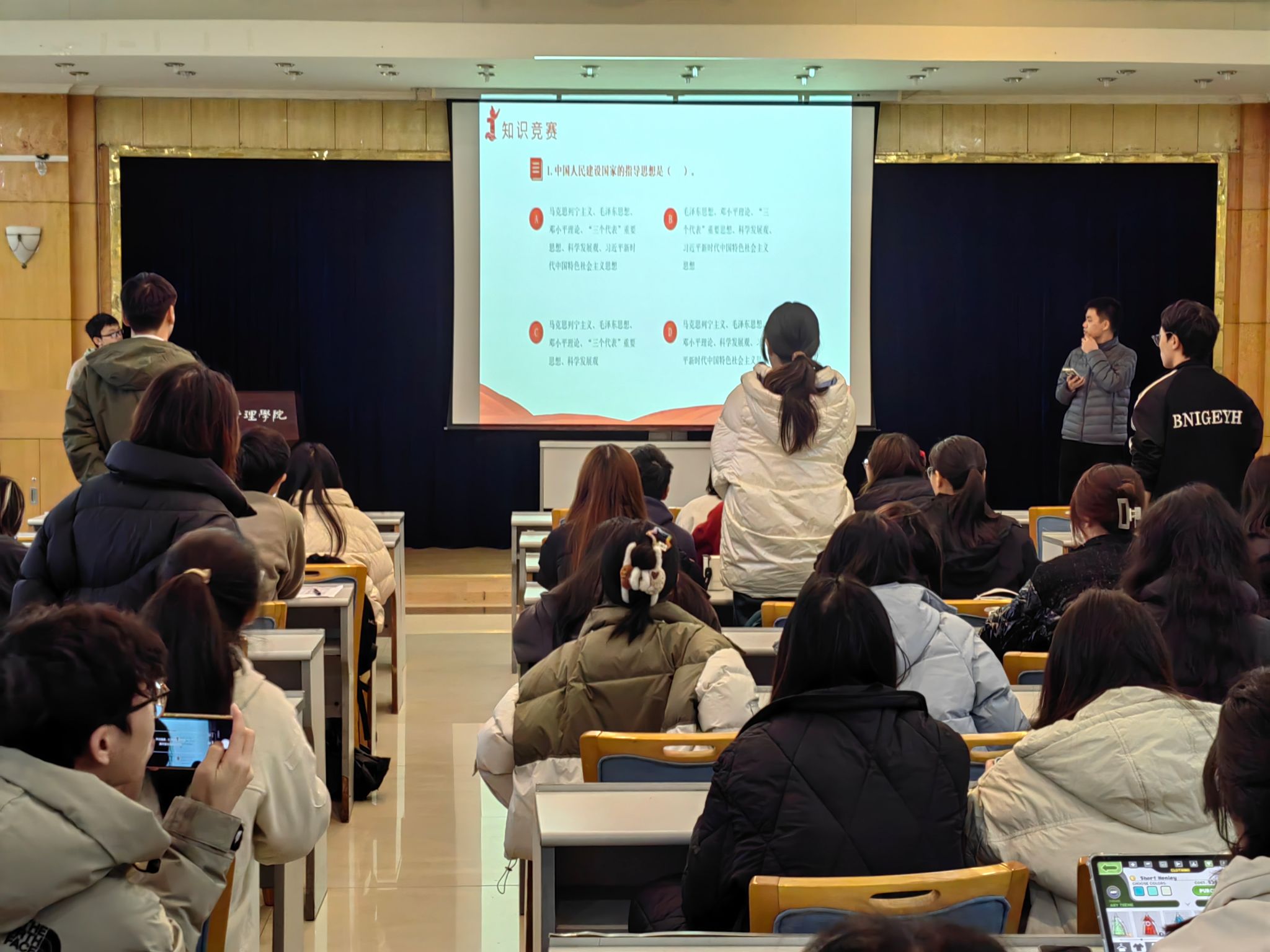 主题活动的第二部分是现场宪法知识竞答,两个支部的党员和入党积极分子一起组成了5支队伍,采用抢答的形式,进行了热烈的比拼,现场气氛活跃,不时响起阵阵掌声和欢呼声。支部还为获胜的队伍准备了纪念品,鼓励大家以赛促学,积极掌握宪法知识。