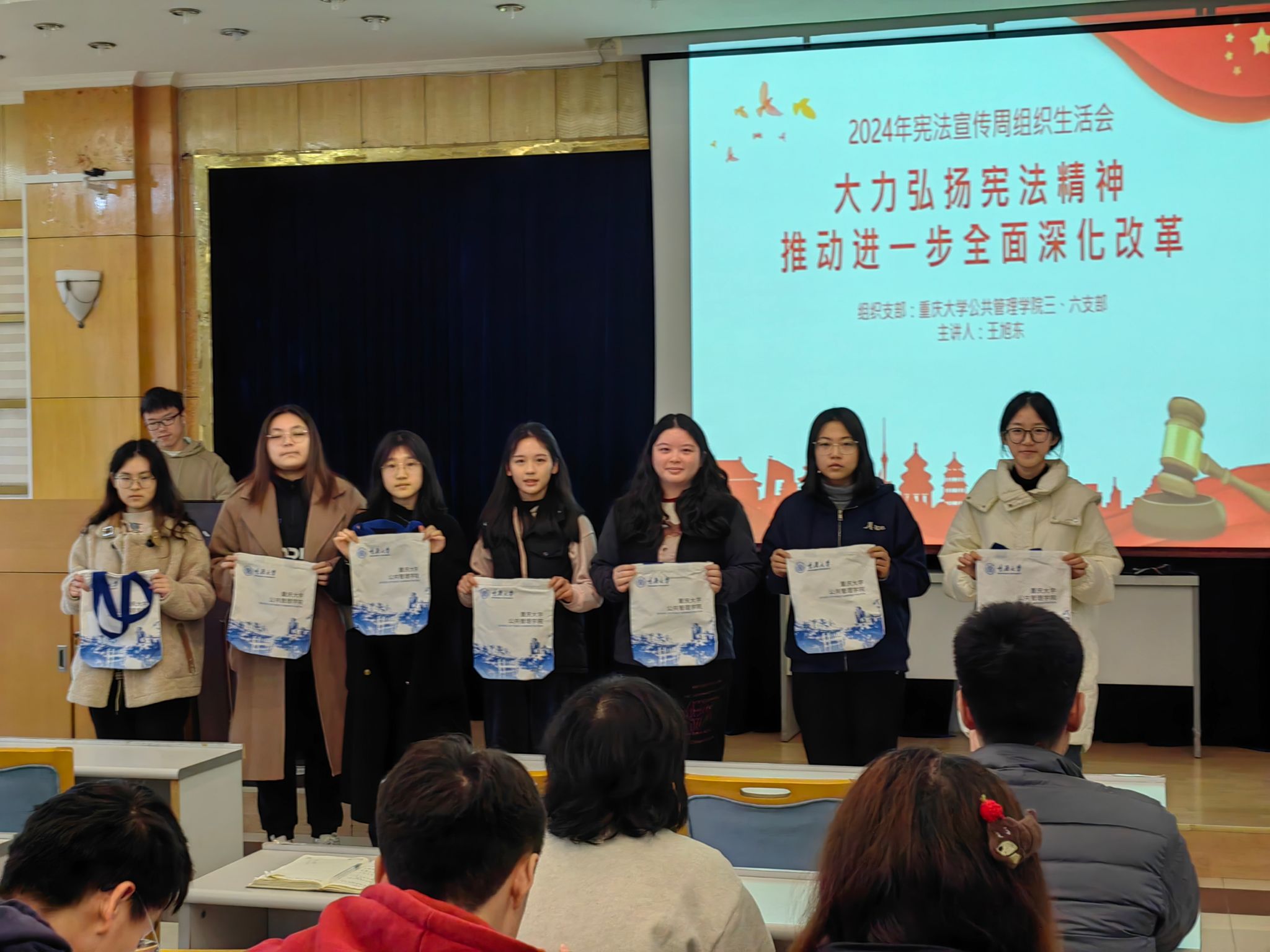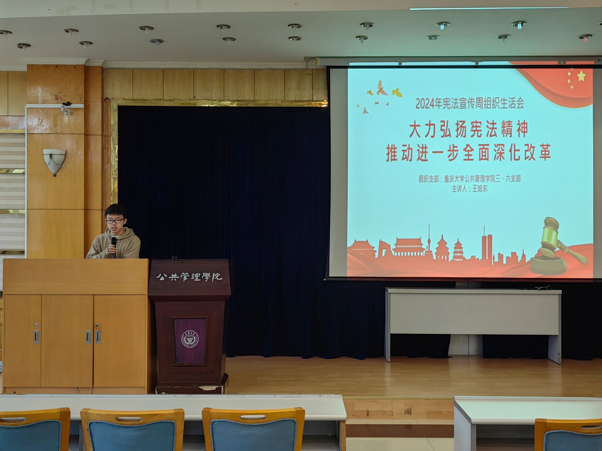 本科生三、六支部在学院楼202会议厅联合开展了以“大力弘扬宪法精神,推动全面深化改革”为主题的党日活动。2023级本科生辅导员徐柳、全体学生党员及入党积极分子到场参加活动。