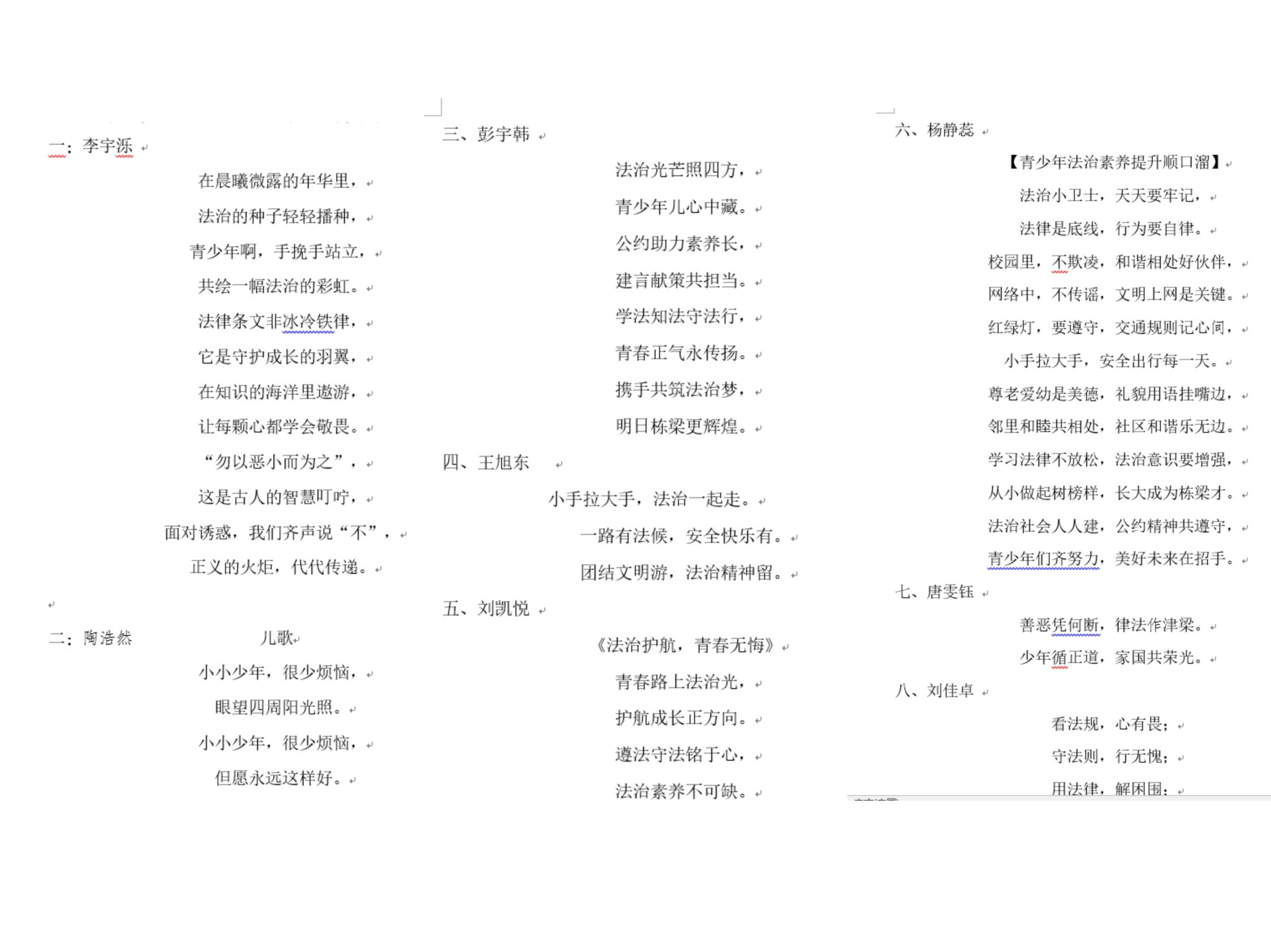 除了线下活动,本科生三、六支部还在线上发起了“我为青少年法治素养提升公约建言献策”的活动,支部成员以及本科2023级的其他同学们都围绕宪法法治精神,通过诗歌、儿歌、打油诗等多种形式,为提升青少年法治素养献计献策。