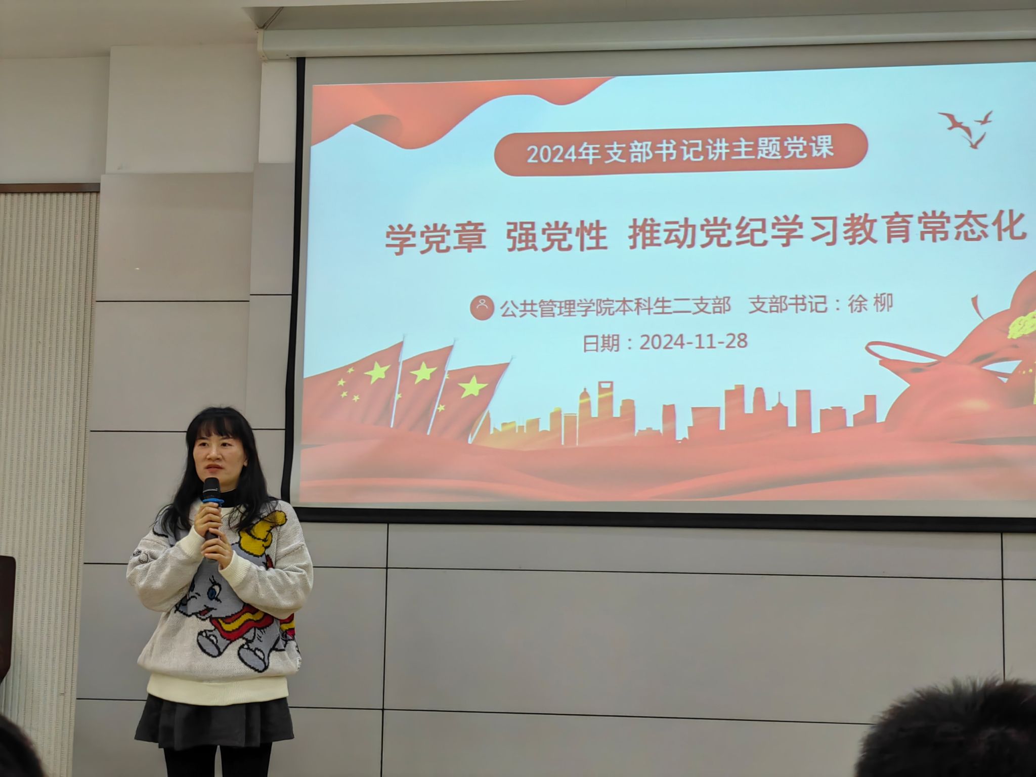 本科生二支部书记徐柳、五支部书记陈致远于2024年11月28日中午在学院102教室为两个支部全体党员讲授了“学党章 强党性 推动党纪学习教育常态化”的主题党课。