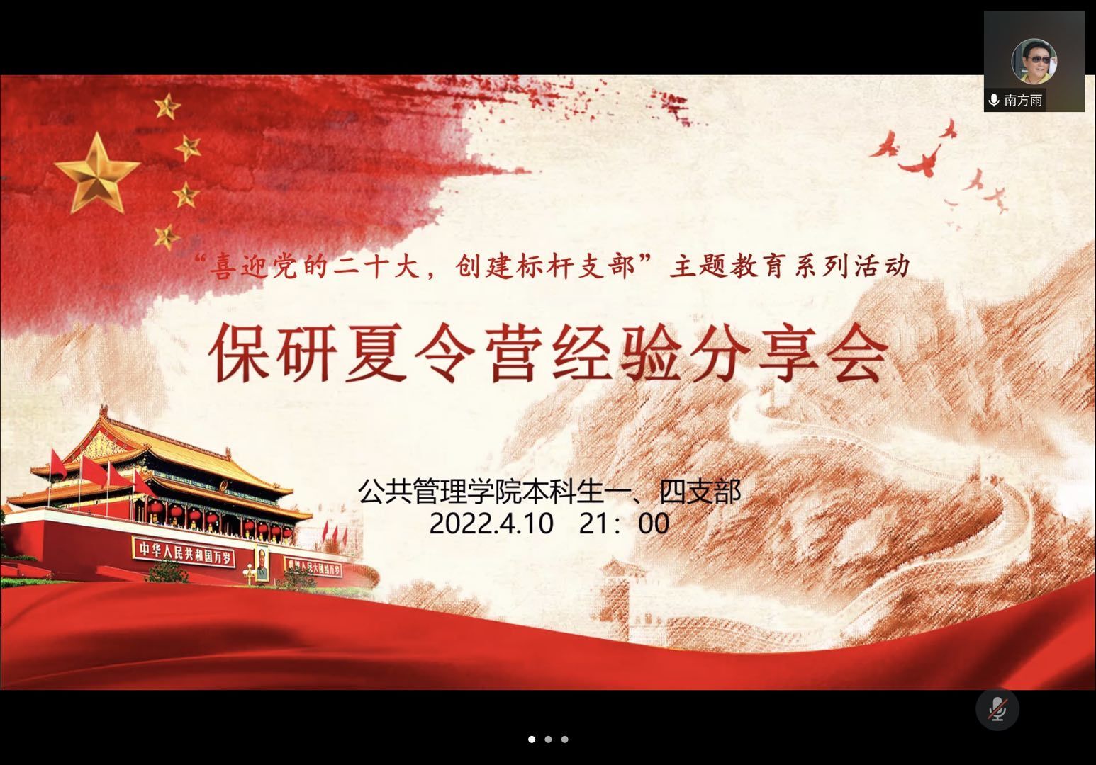 本科生一、四支部于线上举办了“喜迎党的二十大,创建标杆支部”主题教育系列活动之保研夏令营经验分享会专题活动。
