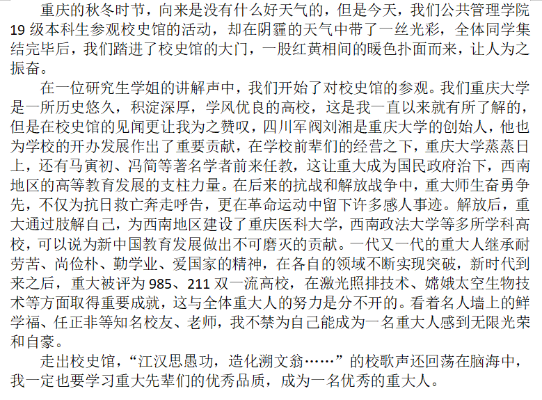 的校风和优良传统的熏陶,才能培育出一代又一代的人才。我们身为当代重大学生,要牢记校训‘耐劳苦,尚俭朴,勤学业,爱国家’,努力学习,未来成为祖国栋梁,为重大争光添彩。”李文慧同志表示:“参观校史馆,在一件件历史遗迹与重大人的光辉事迹中追溯重大精神、唤醒往日记忆、激活今日梦想。”