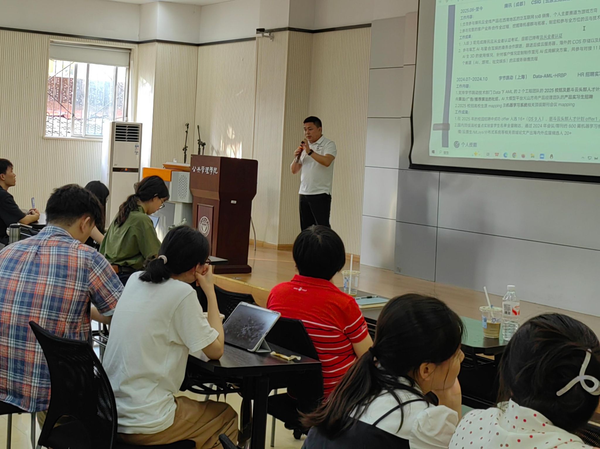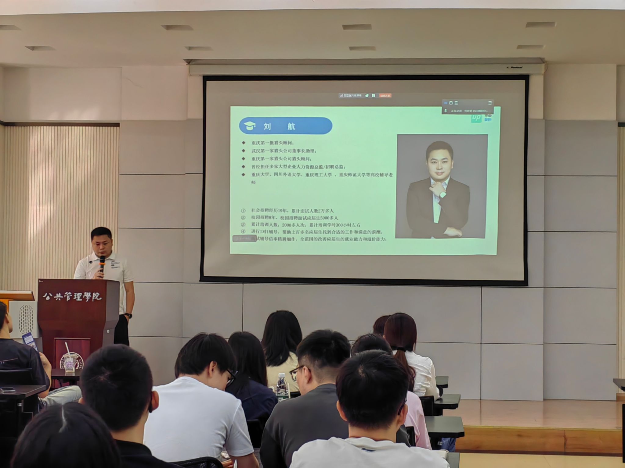 刘老师以“行业认知+简历优化”为核心展开分享。他先从行业概述与发展趋势切入,结合公共管理专业适配领域,分析政企单位、社会组织等行业的人才需求走向;随后聚焦行业常见岗位及招聘要求,详解行政专员、人力资源管理等岗位的能力模型,强调“专业素养+通用技能”的双重价值。