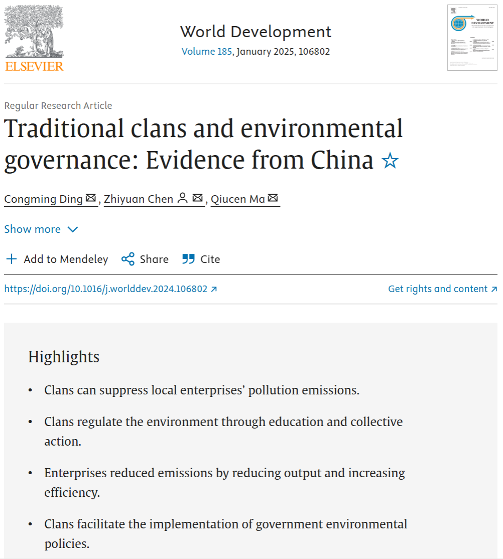 丁从明教授作为第一作者的文章《Traditional clans and environmental governance: Evidence from China》在经济学科高水平期刊World Development在线发表。World Development是发展研究(Development Studies)领域的国际顶级刊物,影响因子在发展研究和经济学期刊领域中长期名列前茅,属于JCR1区和中科院一区Top期刊。该论文是由丁从明教授及其指导的硕士生陈致远,博士生马秋岑共同完成。是近年来在成人影片