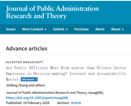 张金凤教授作为第一作者和通讯作者的研究成果“Are Public Officials More Risk-averse than Private Sector Employees in Decision-making? Interest and Accountability Matter”在公共管理学科顶尖期刊Journal of Public Administration Research and Theory(JPART)发表。JPART创刊于1991年,是公共管理研究协会(Public Management Research Association, PMRA)旗舰期刊,AJG(ABS)4星,该期刊影响因子在公共管理学科领域常年位列前三,该期刊以审稿严苛、录用率低著称,是公共管理学科五大顶尖期刊之一。该文章主要由张金凤及其指导的2023级硕士研究生宋敏捷(论文第二作者)等人合作完成。该成果是张金凤教授团队在公共决策研究领域的又一重要突破。