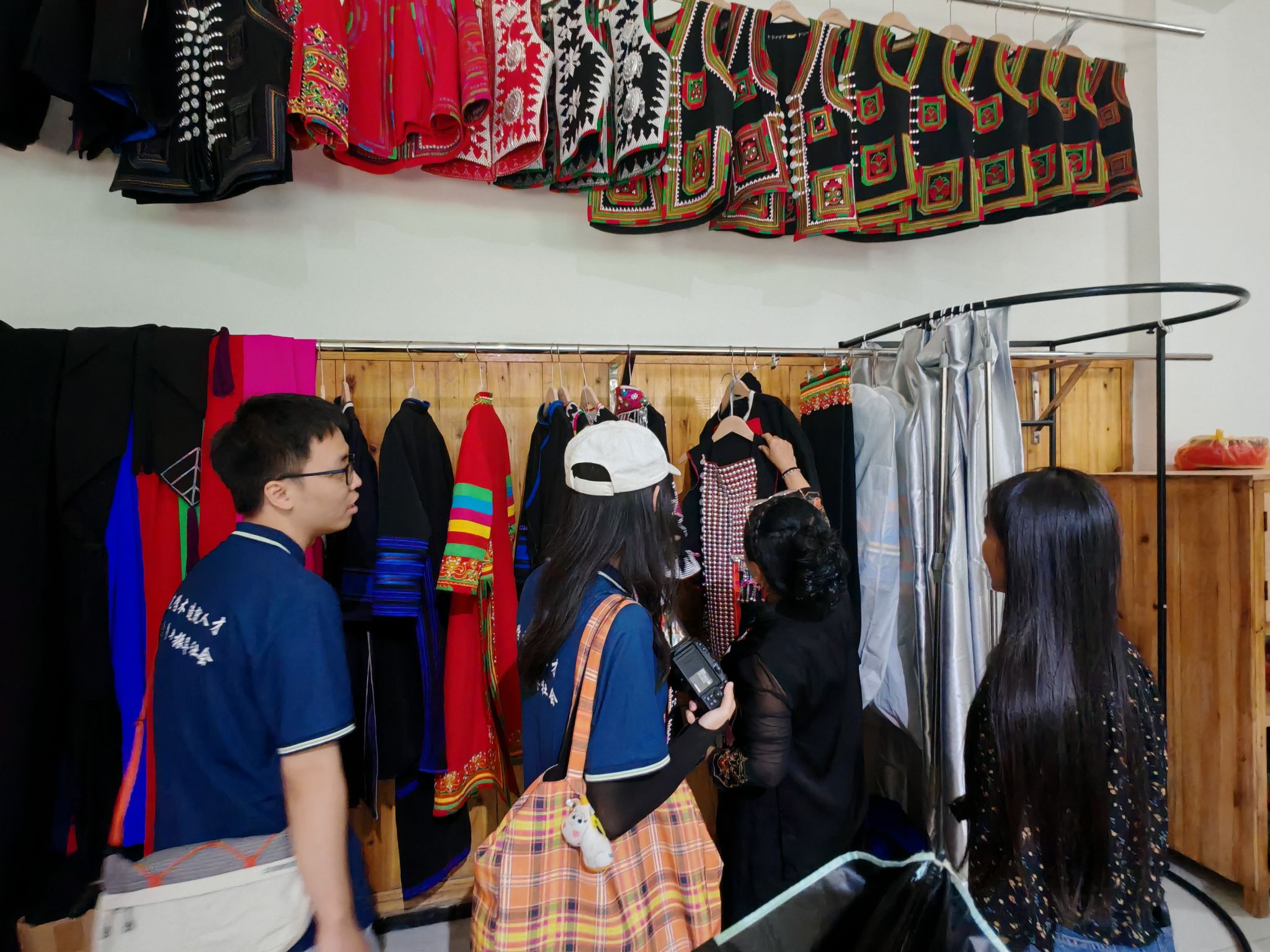 牛洪社区内有这样一家服饰店,陈列着不同民族不同分支的传统服饰,成为了多民族交往交流交融的生动写照。“帕常”白帽与七熠短裤、龟形千层衣与银饰密码、战火淬炼的衣冠志,诉说着哈尼族梯田上的身体叙事。这些服饰从哀牢山的草木中汲取灵感:哈尼人以靛青染布,色如千年梯田的倒影。银饰的造型皆源于土地:螺蛳喻水田丰饶,浮萍银片是生命蔓延的符号,而鱼形胸链则游弋在创世传说的源头……面对多彩的民族服饰,服务团成员深刻体会到各民族优秀文化的深厚底蕴。
