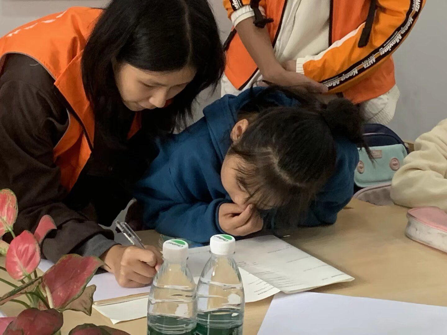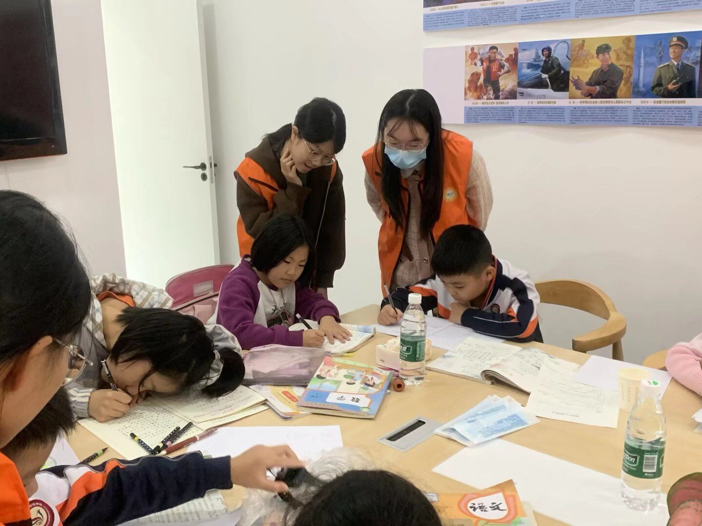 志愿者们耐心地教小朋友们发音、拼读,用真挚的朗读带小朋友们进入课文的世界。遇到困难的数学问题时,志愿者会一步步地推算、讲解,争求让小朋友理解、运用……