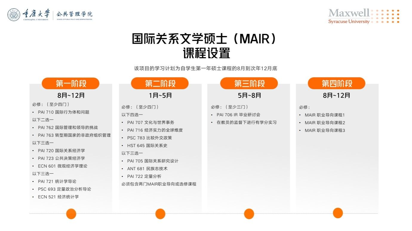 MAIR注重培养学生制定基于证据的解决方案来解决国际问题的能力。课程能获取大量结合作业和现实世界的经验,以上均能使学生为从事有意义的工作做好准备,为各类部门的公共利益服务,例如政府或事业单位、国企央企以及其他非营利组织等等。
