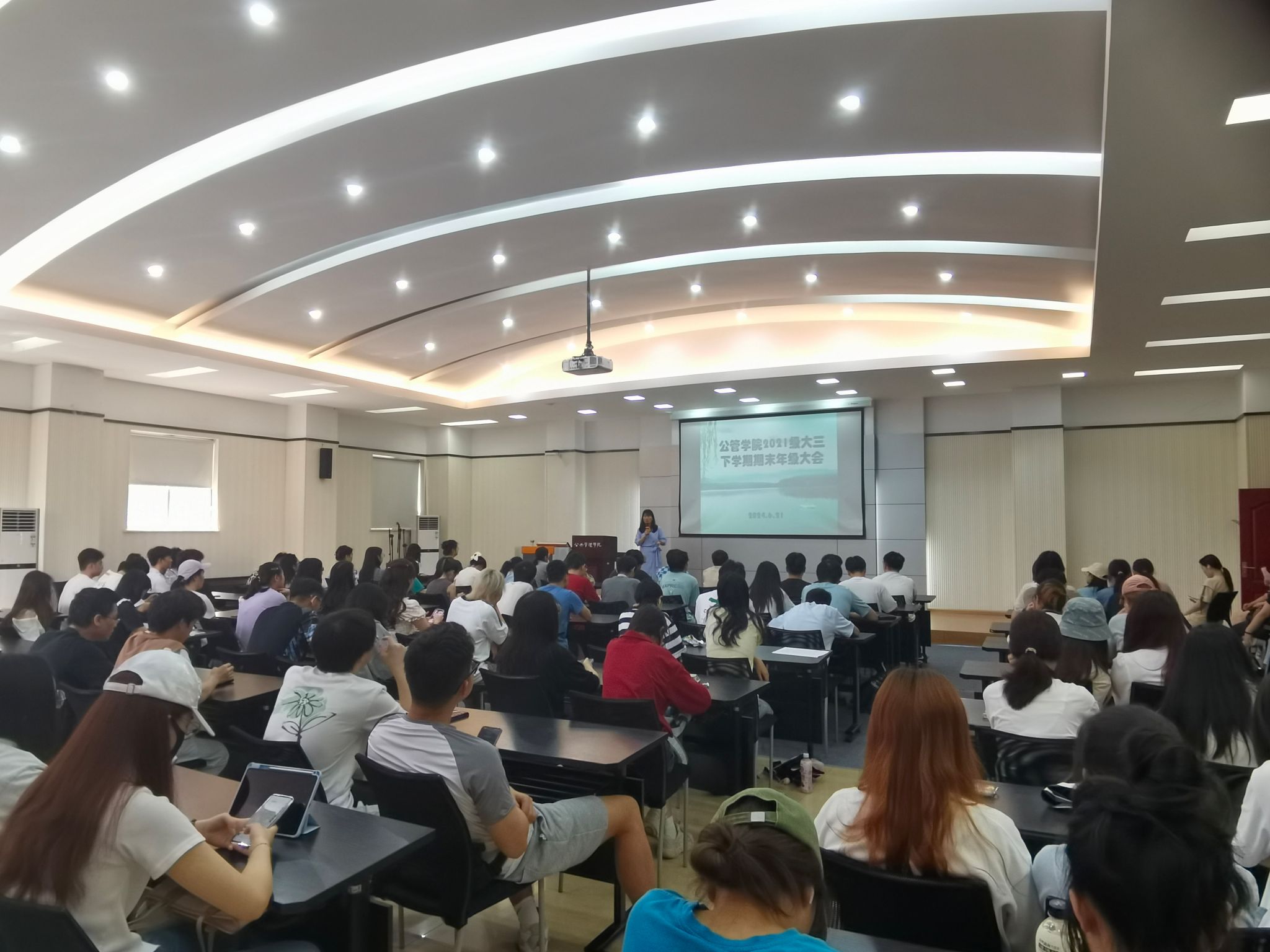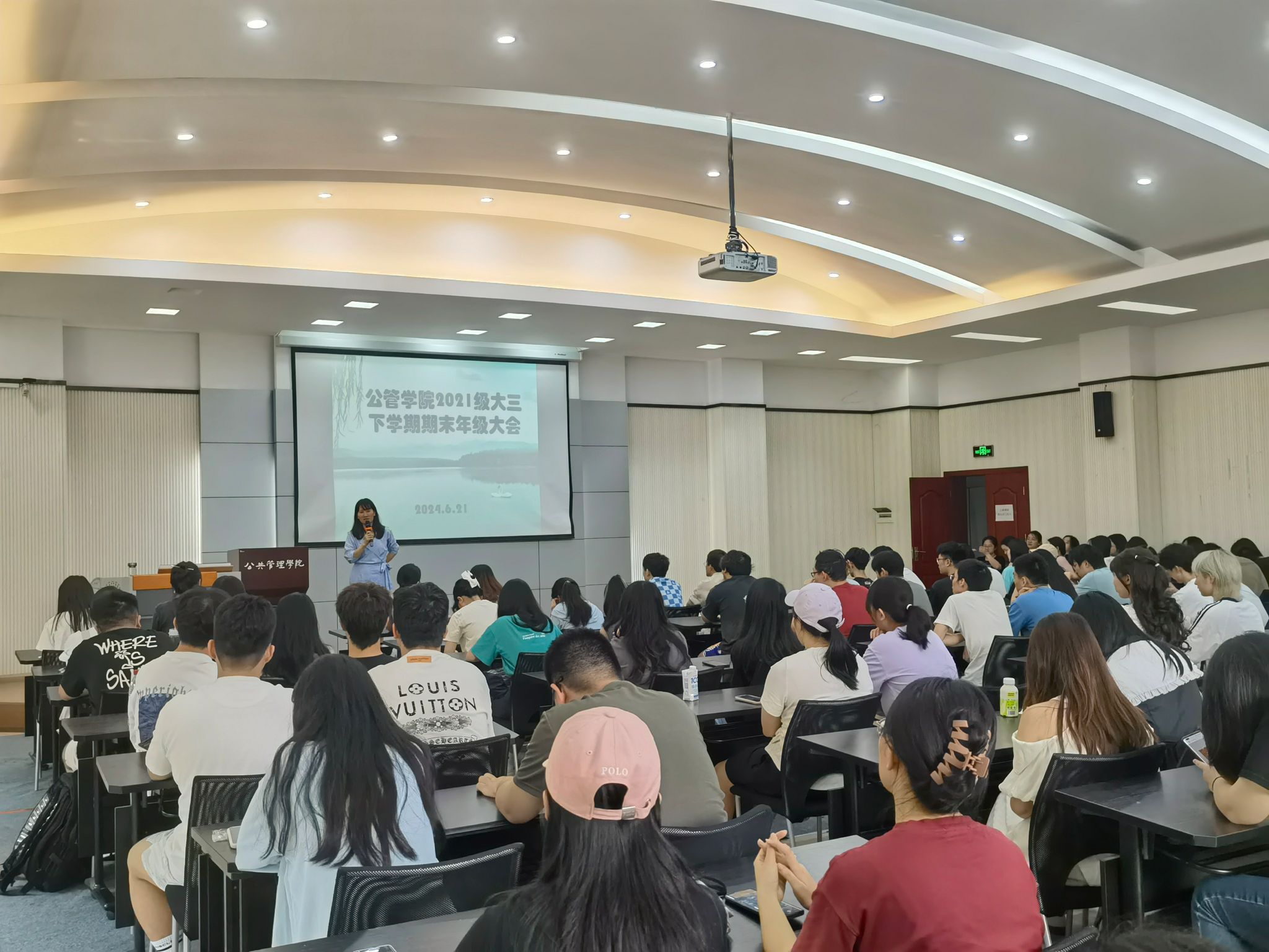 于学院102多功能厅召开2021级本科生2023-2024学年第二学期期末年级大会暨就业升学规划指导大会。本次会议由2021级辅导员徐柳老师主持,2021级全体本科生到场参会。